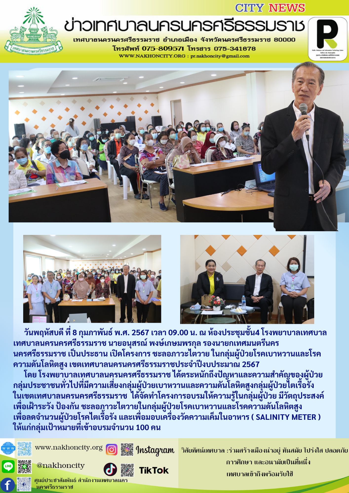 วันพฤหัสบดี ที่ 8 กุมภาพันธ์ พ.ศ. 2567 เวลา 09.00 น. ณ ห้องประชุมชั้น4 โรงพยาบาลเทศบาลเทศบาลนครนครศรีธรรมราช นายอนุสรณ์ พงษ์เกษมพรกุล รองนายกเทศมนตรีนครนครศรีธรรมราช เป็นประธาน เปิดโครงการ ชะลอภาวะไตวาย ในกลุ่มผู้ป่วยโรคเบาหวานและโรคความดันโลหิตสูง เขตเทศบาลนครนครศรีธรรมราชประจำปีงบประมาณ 2567 โดย โรงพยาบาลเทศบาลนครนครศรีธรรมราช ได้ตระหนักถึงปัญหาและความสำคัญของผู้ป่วย กลุ่มประชาชนทั่วไปที่มีความเสี่ยงกลุ่มผู้ป่วยเบาหวานและความดันโลหิตสูงกลุ่มผู้ป่วยไตเรื้อรัง ในเขตเทศบาลนครนครศรีธรรมราช ได้จัดทำโครงการอบรมให้ความรู้ในกลุ่มผู้ป่วย มีวัตถุประสงค์ เพื่อเฝ้าระวัง ป้องกัน ชะลอภาวะไตวายในกลุ่มผู้ป่วยโรคเบาหวานและโรคความดันโลหิตสูง เพื่อลดจำนวนผู้ป่วยโรคไตเรื้อรัง และเพื่อมอบเครื่องวัดความเค็มในอาหาร ( salinity meter )ให้แก่กลุ่มเป้าหมายที่เข้าอบรมจำนวน 100 คน |