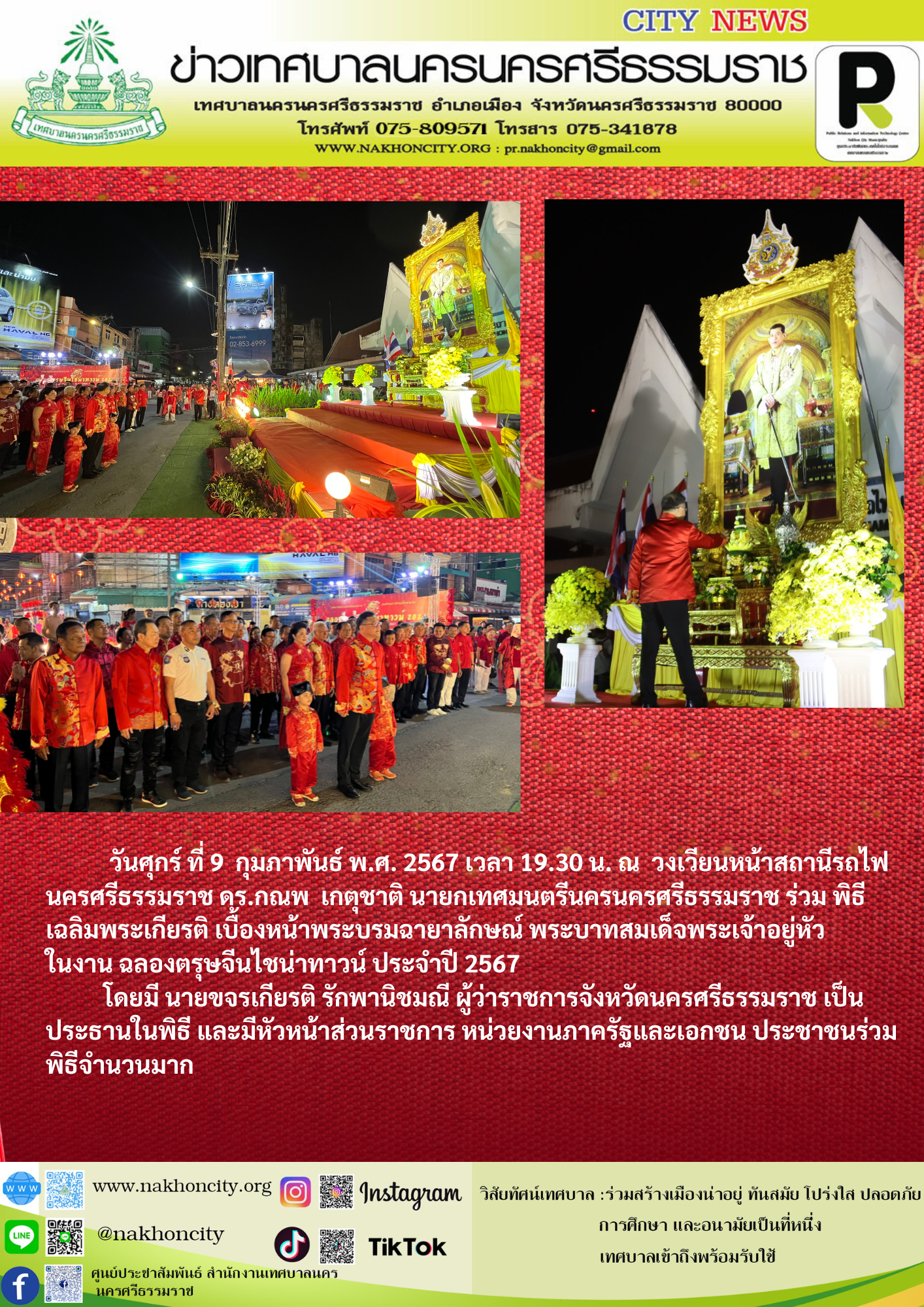 วันศุกร์ ที่ 9 กุมภาพันธ์ พ.ศ. 2567 เวลา 19.30 น. ณ วงเวียนหน้าสถานีรถไฟนครศรีธรรมราช ดร.กณพ เกตุชาติ นายกเทศมนตรีนครนครศรีธรรมราช ร่วม พิธีเฉลิมพระเกียรติ เบื้องหน้าพระบรมฉายาลักษณ์ พระบาทสมเด็จพระเจ้าอยู่หัว ในงาน ฉลองตรุษจีนไชน่าทาวน์ ประจำปี 2567 โดยมี นายขจรเกียรติ รักพานิชมณี ผู้ว่าราชการจังหวัดนครศรีธรรมราช เป็นประธานในพิธี และมีหัวหน้าส่วนราชการ หน่วยงานภาครัฐและเอกชน ประชาชนร่วมพิธีจำนวนมาก |