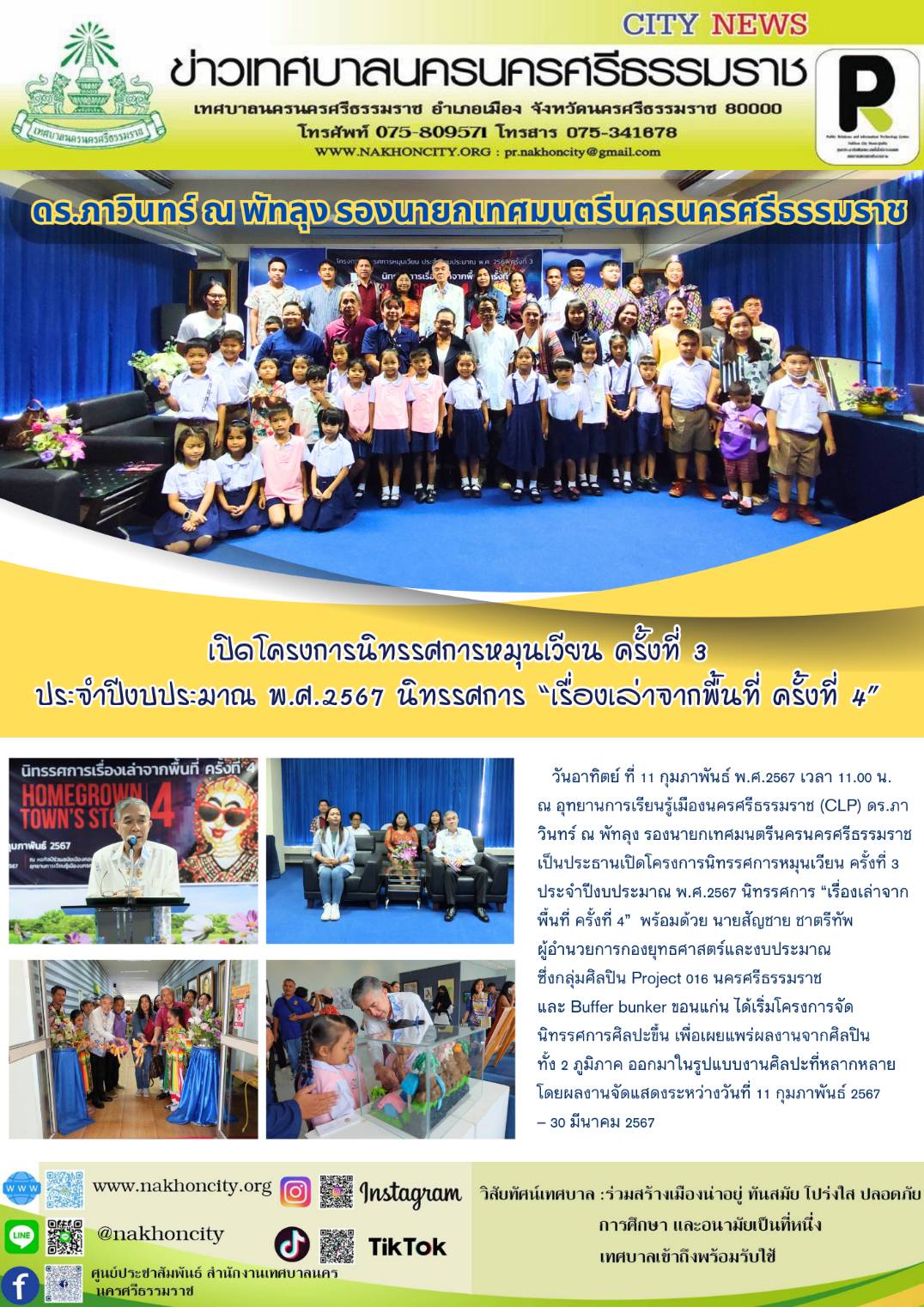 ดร.ภาวินทร์ ณ พัทลุง รองนายกเทศมนตรีนครนครศรีธรรมราช เป็นประธานเปิดโครงการนิทรรศการหมุนเวียน ครั้งที่ 3 ประจำปีงบประมาณ พ.ศ.2567 นิทรรศการ “เรื่องเล่าจากพื้นที่ ครั้งที่ 4” |
