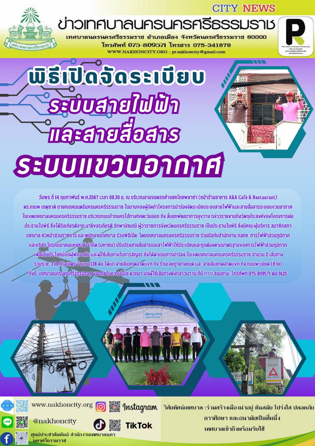 พิธีเปิดโครงการนำร่องจัดระเบียบระบบสายไฟฟ้าและสายสื่อสารระบบแขวนอากาศในเขตเทศบาลนครนครศรีธรรมราช บริเวณถนนปากนครไปทางทิศตะวันออก ถึง สี่แยกพัฒนาการคูขวาง |