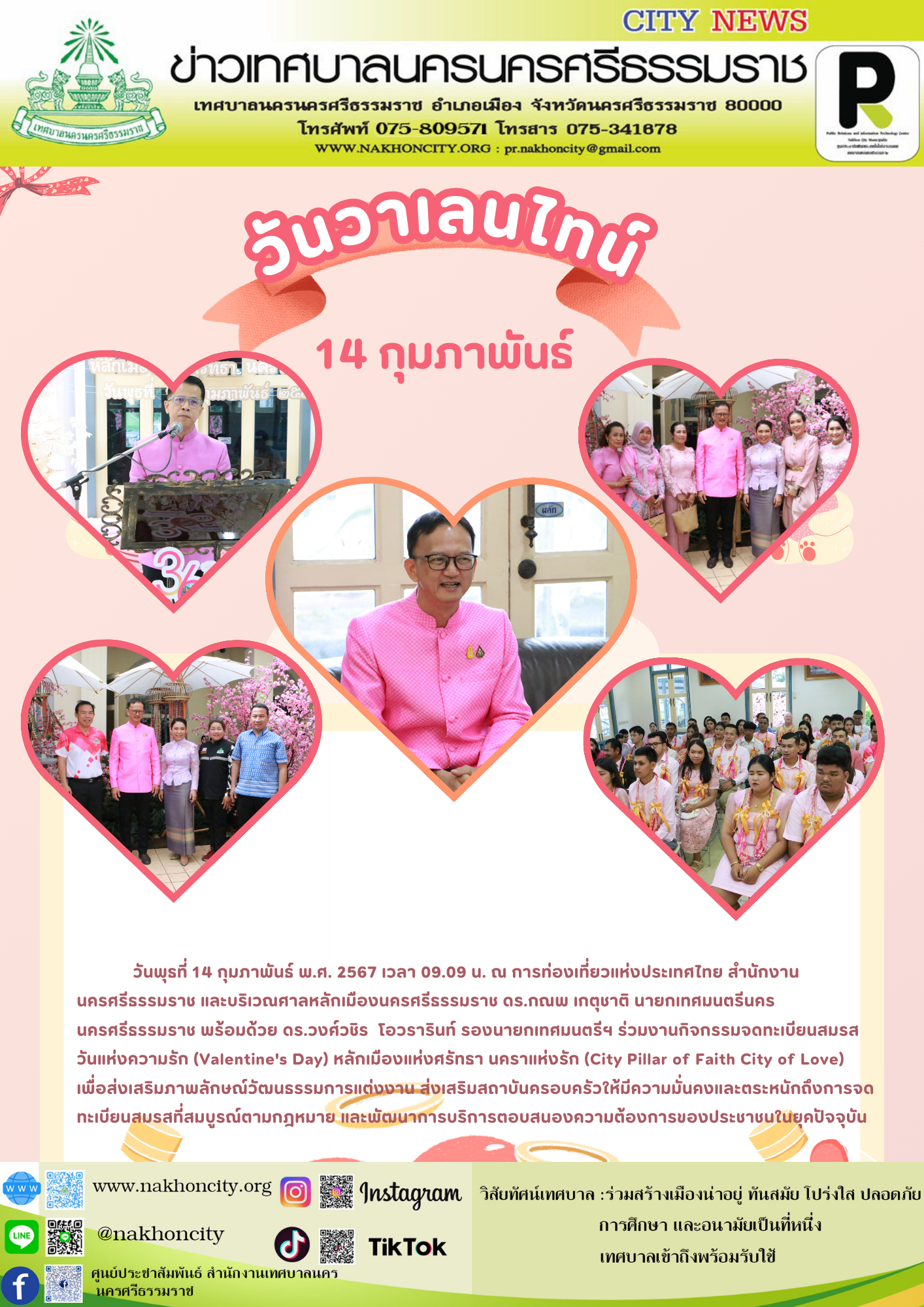 วันพุธที่ 14 กุมภาพันธ์ พ.ศ. 2567 เวลา 09.09 น. ณ การท่องเที่ยวแห่งประเทศไทย สำนักงานนครศรีธรรมราช และบริเวณศาลหลักเมืองนครศรีธรรมราช ดร.กณพ เกตุชาติ นายกเทศมนตรีนครนครศรีธรรมราช พร้อมด้วยดร.วงศ์วชิร โอวรารินท์ รองนายกเทศมนตรีฯ ร่วมงานกิจกรรมจดทะเบียนสมรสวันแห่งความรัก (Valentine's Day) หลักเมืองแห่งศรัทธา นคราแห่งรัก (City Pillar of Faith City of Love) เพื่อส่งเสริมภาพลักษณ์วัฒนธรรมการแต่งงาน ส่งเสริมสถาบันครอบครัวให้มีความมั่นคงและตระหนักถึงการจดทะเบียนสมรสที่สมบูรณ์ตามกฎหมาย และพัฒนาการบริการตอบสนองความต้องการของประชาชนในยุคปัจจุบัน