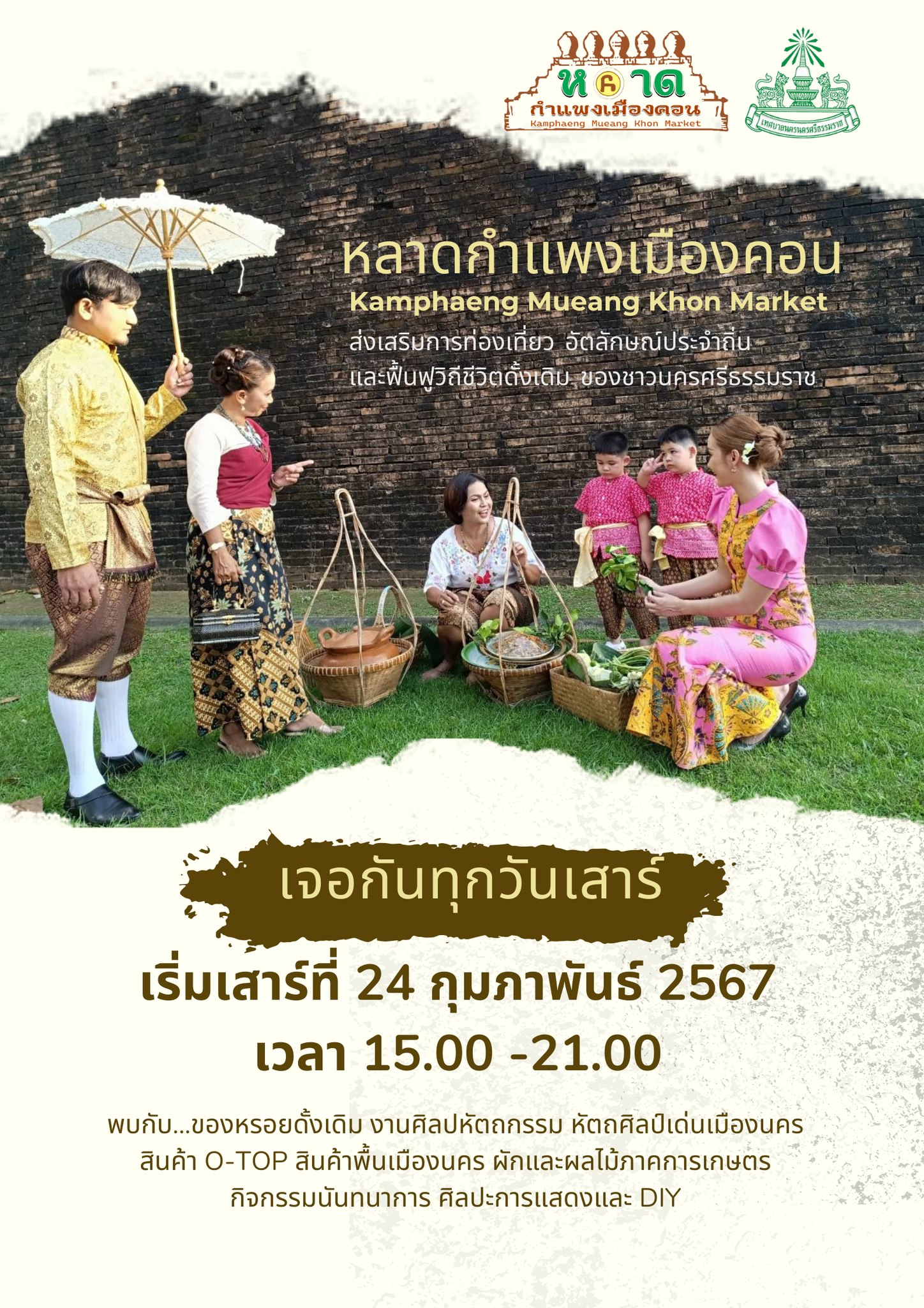 เทศบาลนครนครศรีธรรมราช กำหนด เปิด “หลาดกำแพงเมืองคอน” ตลาดนัดท้องถิ่นสีเขียว ส่งเสริมเศรษฐกิจฐานราก การผลิต การตลาด และการจำหน่าย สินค้าท้องถิ่น เริ่ม นัดแรก วันเสาร์ที่ 24 กุมภาพันธ์ 2567 |