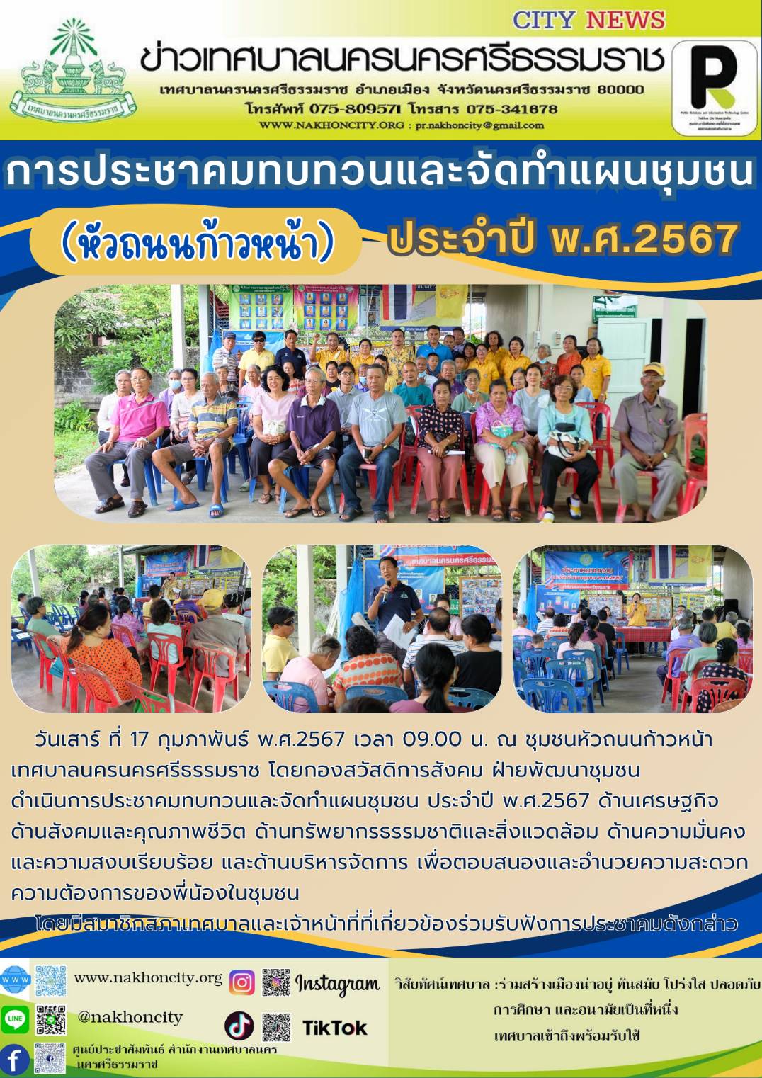 เทศบาลนครนครศรีธรรมราช โดยกองสวัสดิการสังคม ฝ่ายพัฒนาชุมชน ดำเนินการประชาคมทบทวนและจัดทำแผนชุมชน ประจำปี พ.ศ.2567 (ชุมชนหัวถนนก้าวหน้า) |
