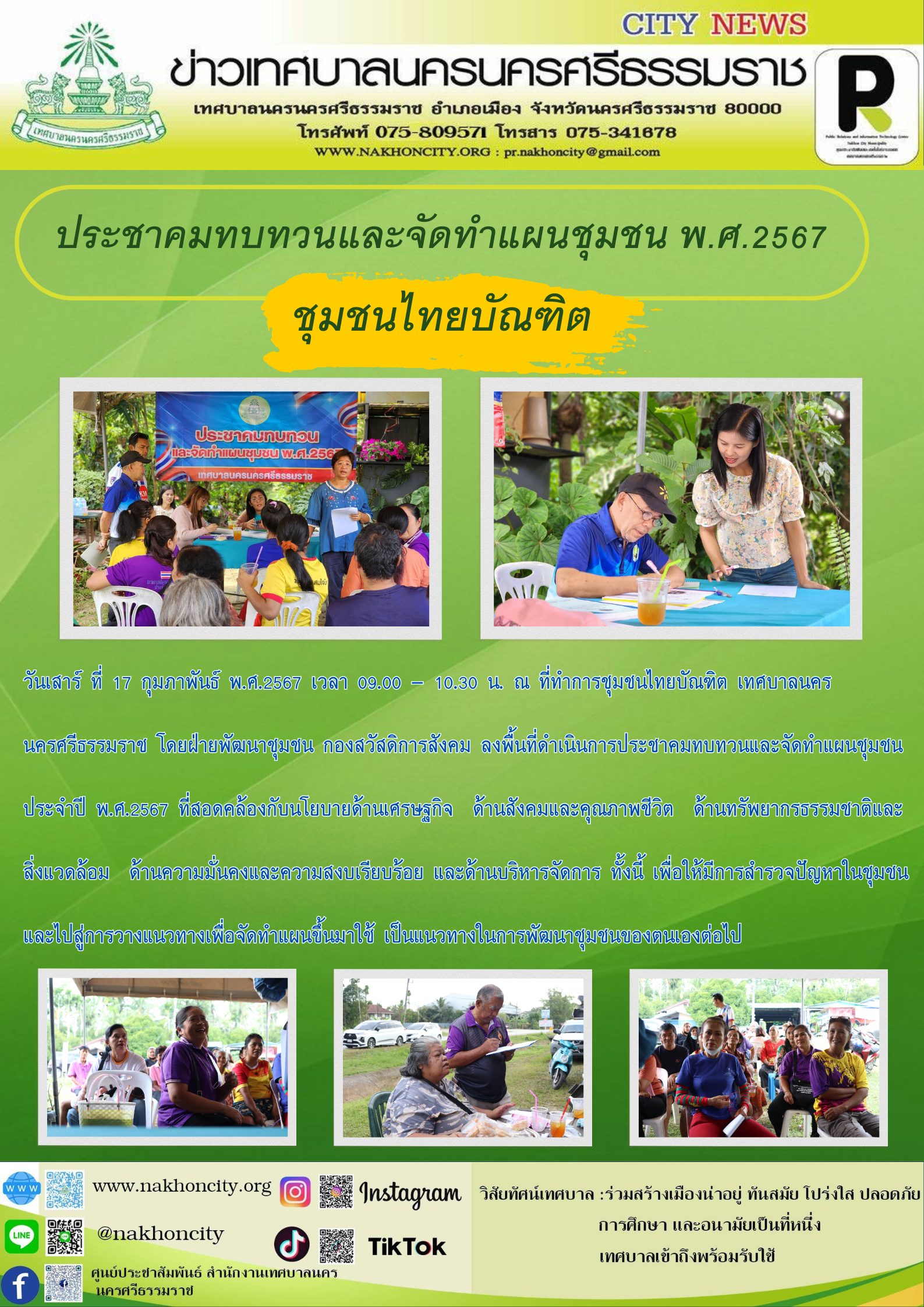 เทศบาลนครนครศรีธรรมราช โดยฝ่ายพัฒนาชุมชน กองสวัสดิการสังคม ลงพื้นที่ดำเนินการประชาคมทบทวนและจัดทำแผนชุมชน ประจำปี พ.ศ.2567 (ชุมชนไทยบัณฑิต) |