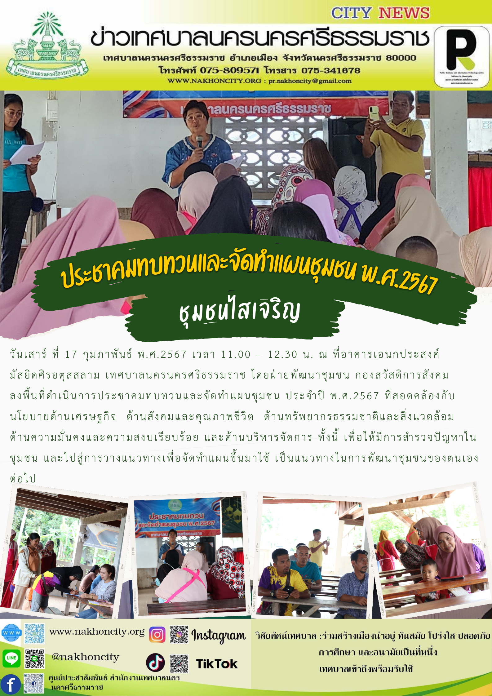เทศบาลนครนครศรีธรรมราช โดยฝ่ายพัฒนาชุมชน กองสวัสดิการสังคม ลงพื้นที่ดำเนินการประชาคมทบทวนและจัดทำแผนชุมชน ประจำปี พ.ศ.2567 (ชุมชนไสเจริญ) |