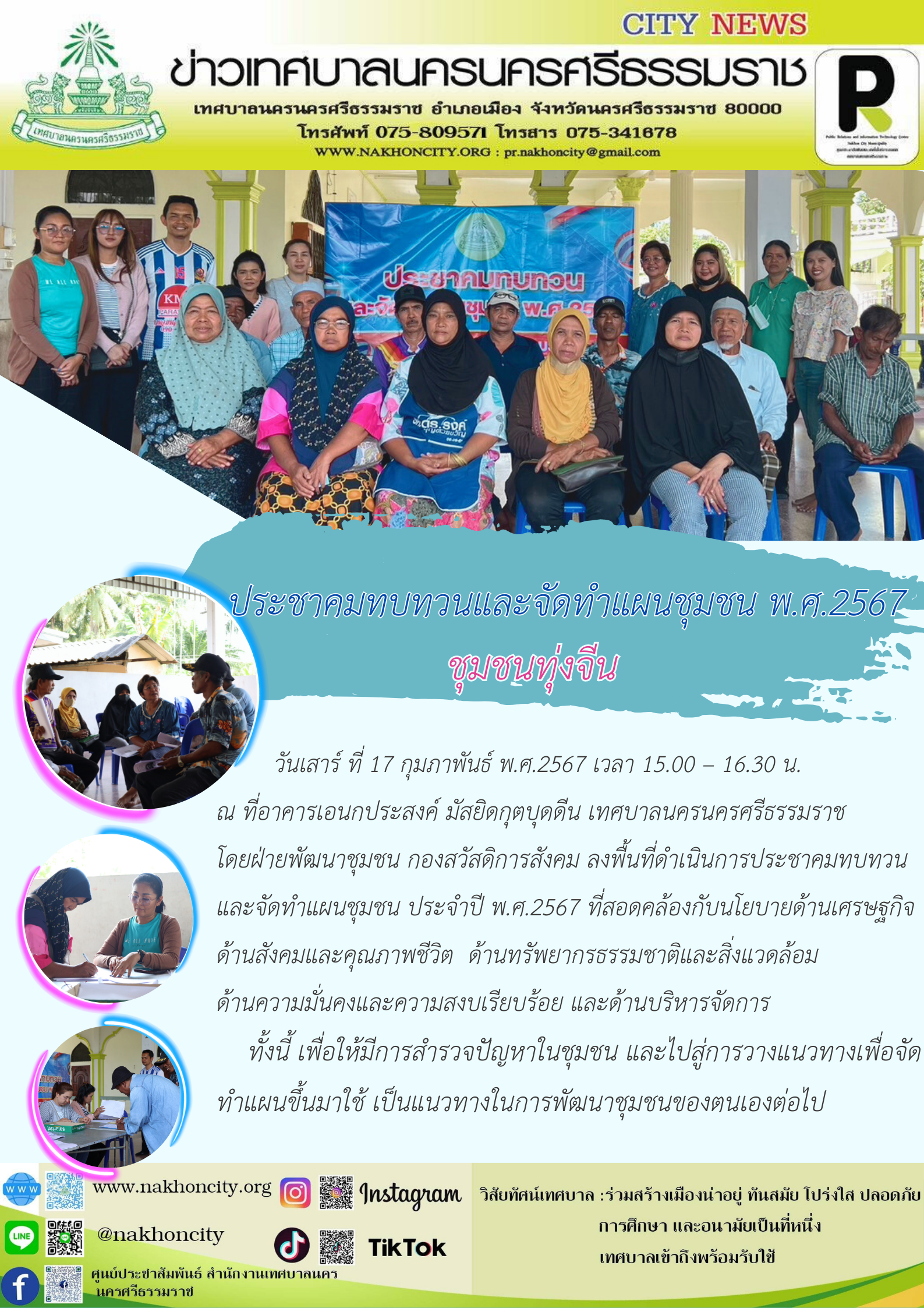 วันเสาร์ ที่ 17 กุมภาพันธ์ พ.ศ.2567 เวลา 15.00 -16.30 น. ณ อาคารเอนกประสงค์ มัสยิดกุตบุดดีน เทศบาลนครนครศรีธรรมราช โดยฝ่ายพัฒนาชุมชน กองสวัสดิการสังคม ลงพื้นที่ดำเนินการประชาคมทบทวนและจัดทำแผนชุมชน ประจำปี พ.ศ.2567 ที่สอดคล้องกับนโยบายด้านเศรษฐกิจ ด้านสังคมและคุณภาพชีวิต ด้านทรัพยากรธรรมชาติและสิ่งแวดล้อม ด้านความมั่นคงและความสงบเรียบร้อย และด้านบริหารจัดการ ทั้งนี้ เพื่อให้มีการสำรวจปัญหาในชุมชน และไปสู่การวางแนวทางเพื่อจัดทำแผนขึ้นมาใช้ เป็นแนวทางในการพัฒนาชุมชนของตนเองต่อไป