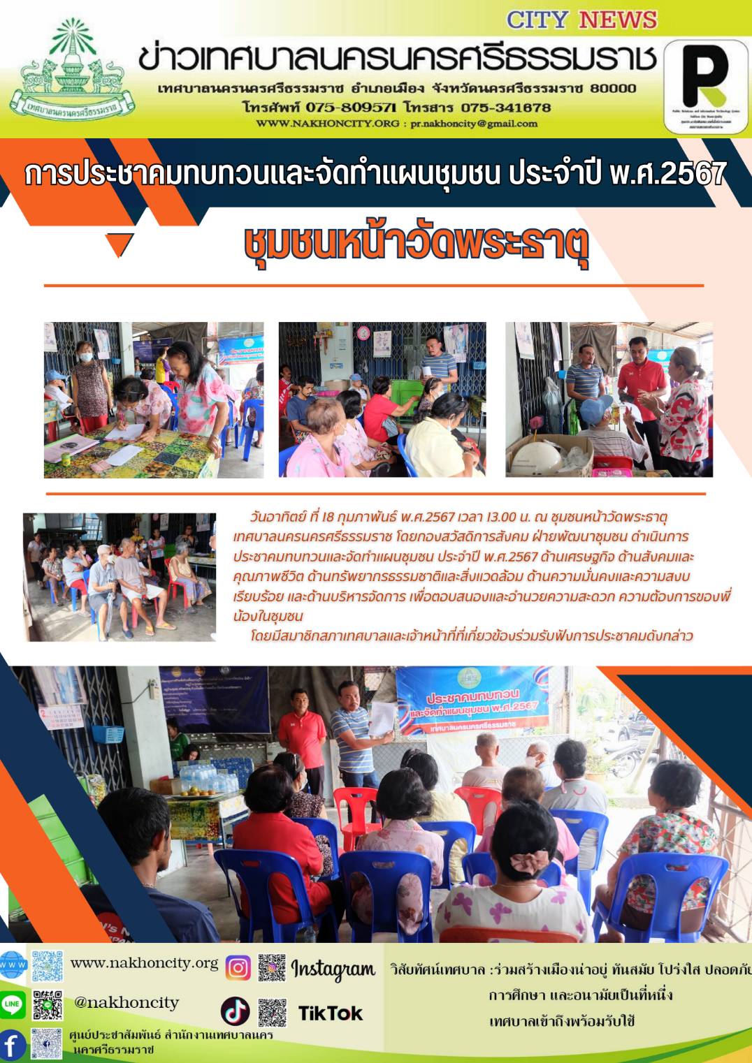 เทศบาลนครนครศรีธรรมราช โดยกองสวัสดิการสังคม ฝ่ายพัฒนาชุมชน ดำเนินการประชาคมทบทวนและจัดทำแผนชุมชน ประจำปี พ.ศ.2567 (ชุมชนหน้าวัดพระธาตุ) |