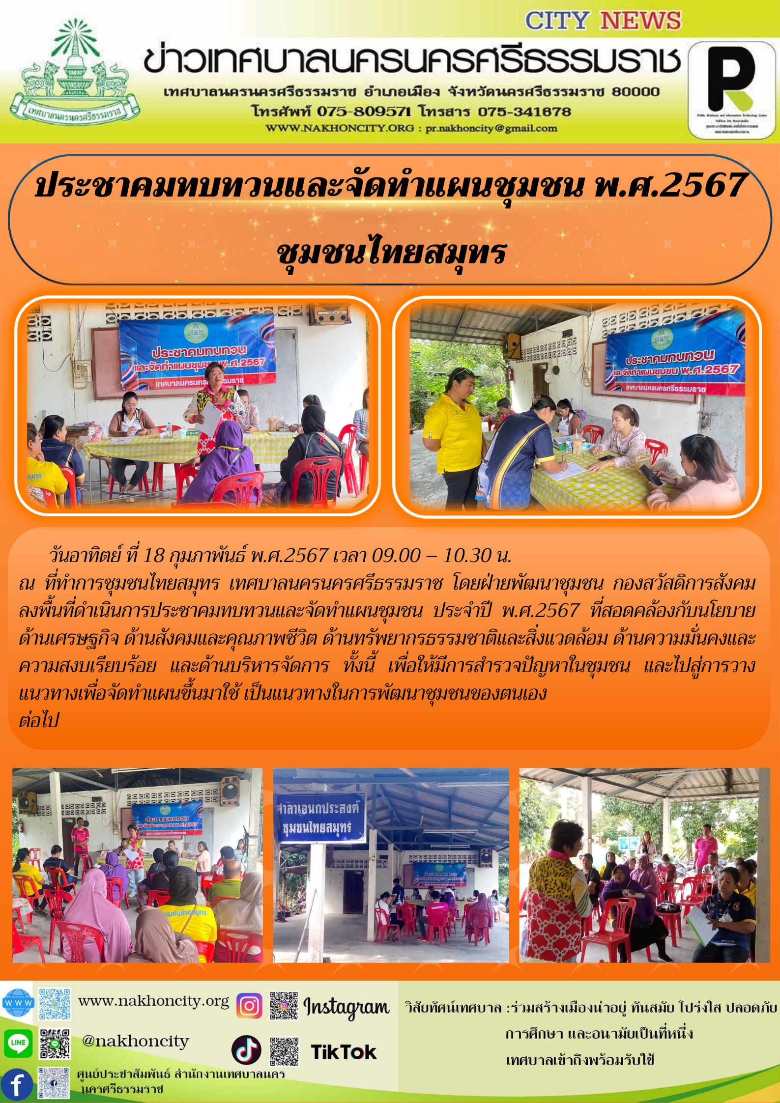 เทศบาลนครนครศรีธรรมราช โดยฝ่ายพัฒนาชุมชน กองสวัสดิการสังคม ลงพื้นที่ดำเนินการประชาคมทบทวนและจัดทำแผนชุมชน ประจำปี พ.ศ.2567 (ชุมชนไทยสมุทร) |