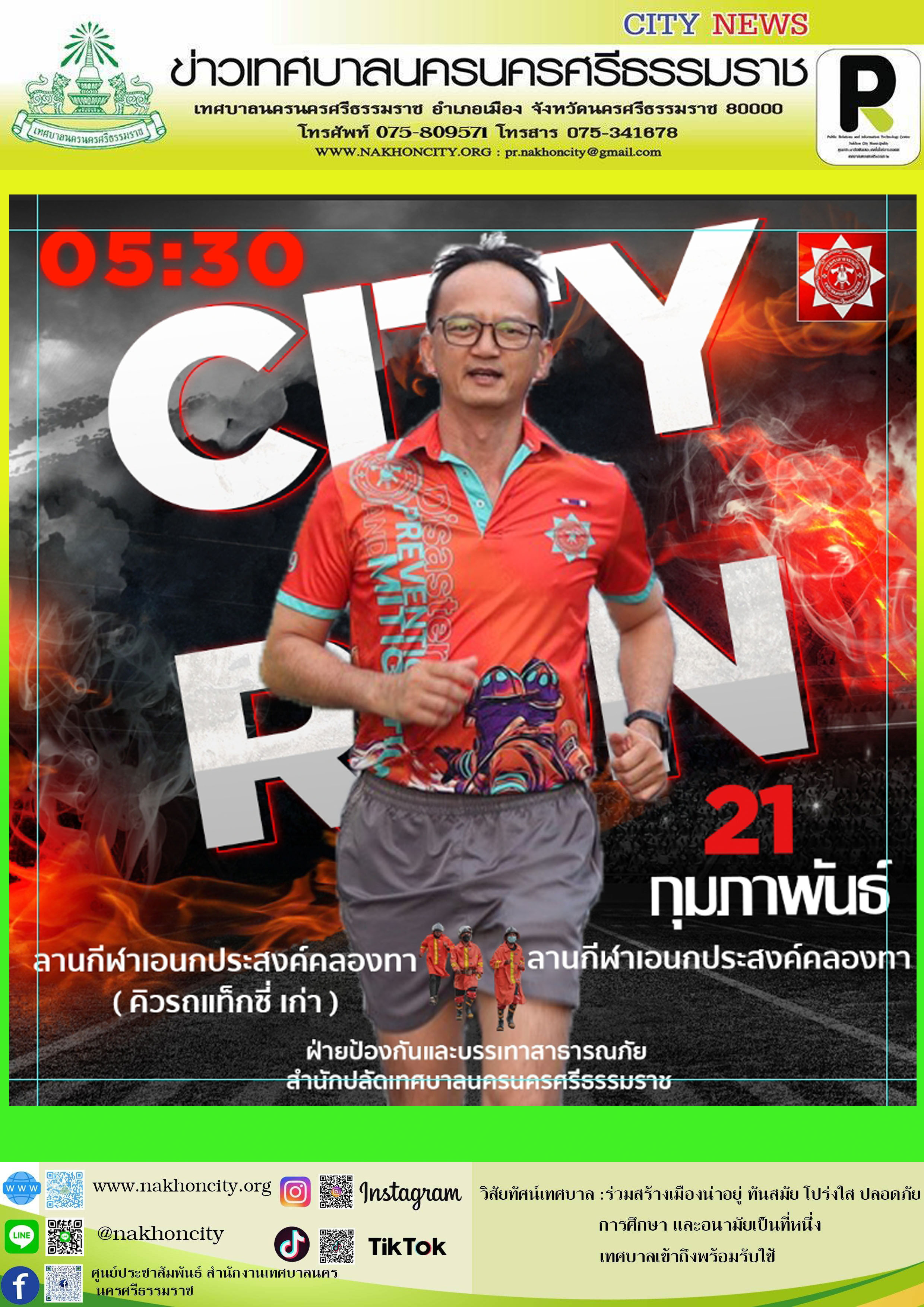 เทศบาลนครนครศรีธรรมราช ขอเชิญประชาชนร่วมกิจกรรม วิ่ง “City Run” วันพุธ วันพุธที่ 21 กุมภาพันธ์ 2567 เวลา 05.30 น. ณ จุดนัดพบ ลานกีฬาอเนกประสงค์คลองทา (คิวแท็กซี่เก่า) |