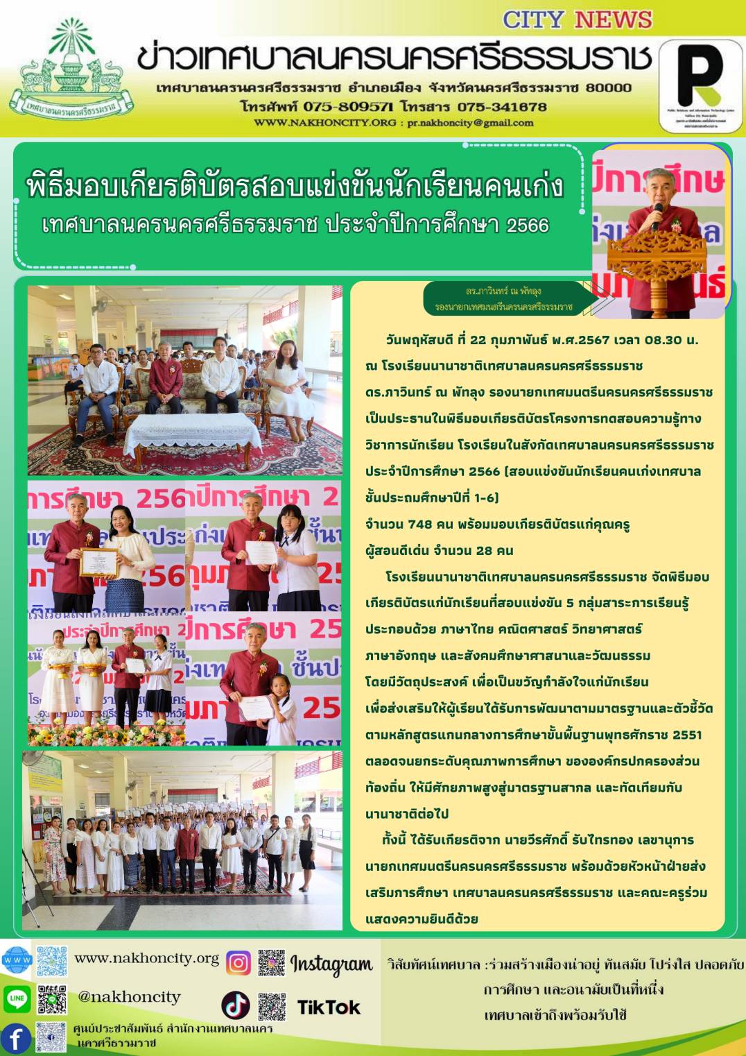 ดร.ภาวินทร์ ณ พัทลุง รองนายกเทศมนตรีนครนครศรีธรรมราช เป็นประธานในพิธีมอบเกียรติบัตรโครงการทดสอบความรู้ทางวิชาการนักเรียน โรงเรียนในสังกัดเทศบาลนครนครศรีธรรมราช ประจำปีการศึกษา 2566 |