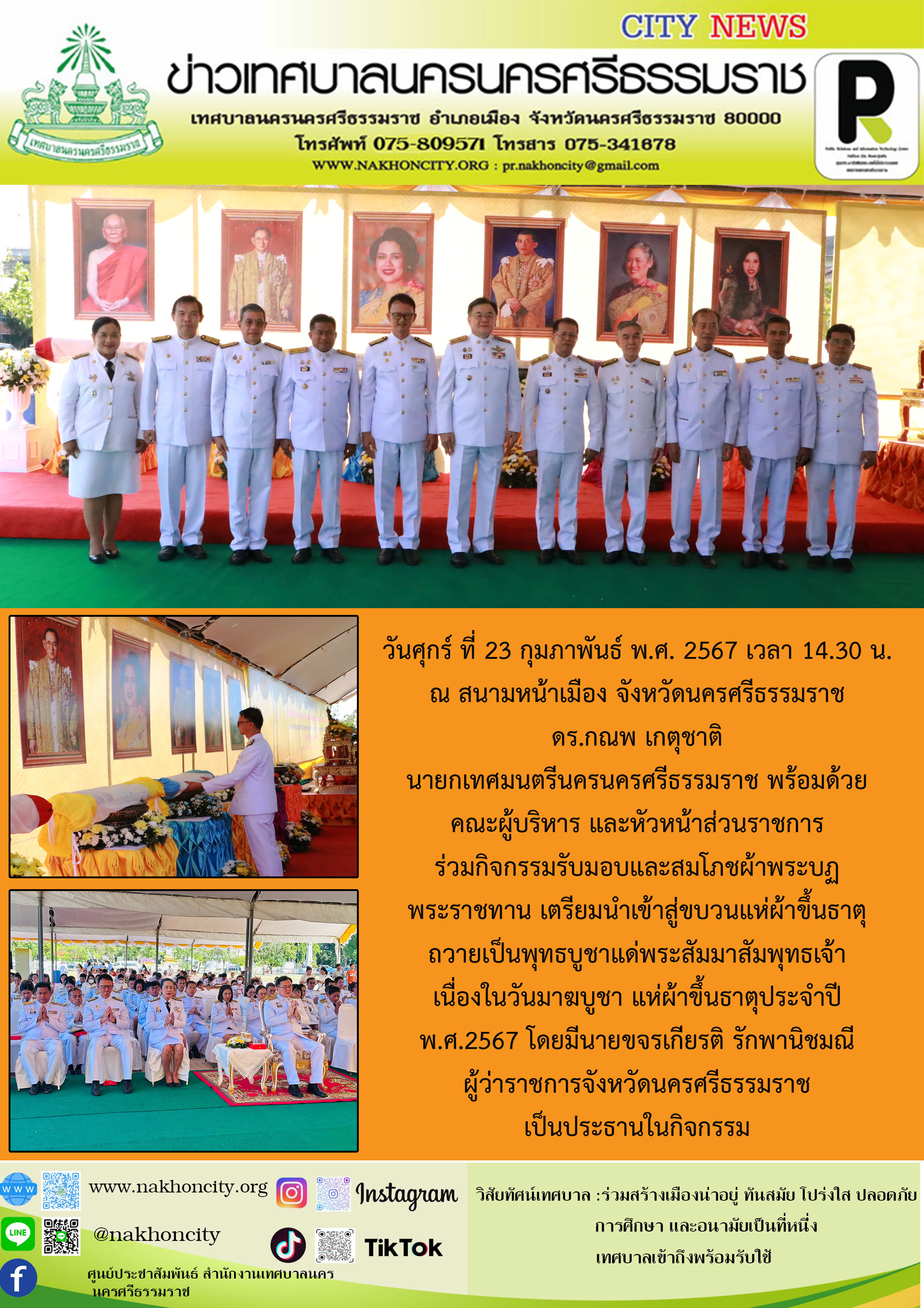 ร.กณพ เกตุชาติ นายกเทศมนตรีนครนครศรีธรรมราช พร้อมด้วย คณะผู้บริหาร และหัวหน้าส่วนราชการ ร่วมกิจกรรมรับมอบและสมโภชผ้าพระบฏพระราชทาน เตรียมนำเข้าสู่ขบวนแห่ผ้าขึ้นธาตุ ถวายเป็นพุทธบูชาแด่พระสัมมาสัมพุทธเจ้า เนื่องในวันมาฆบูชา แห่ผ้าขึ้นธาตุประจำปี พ.ศ.2567 |
