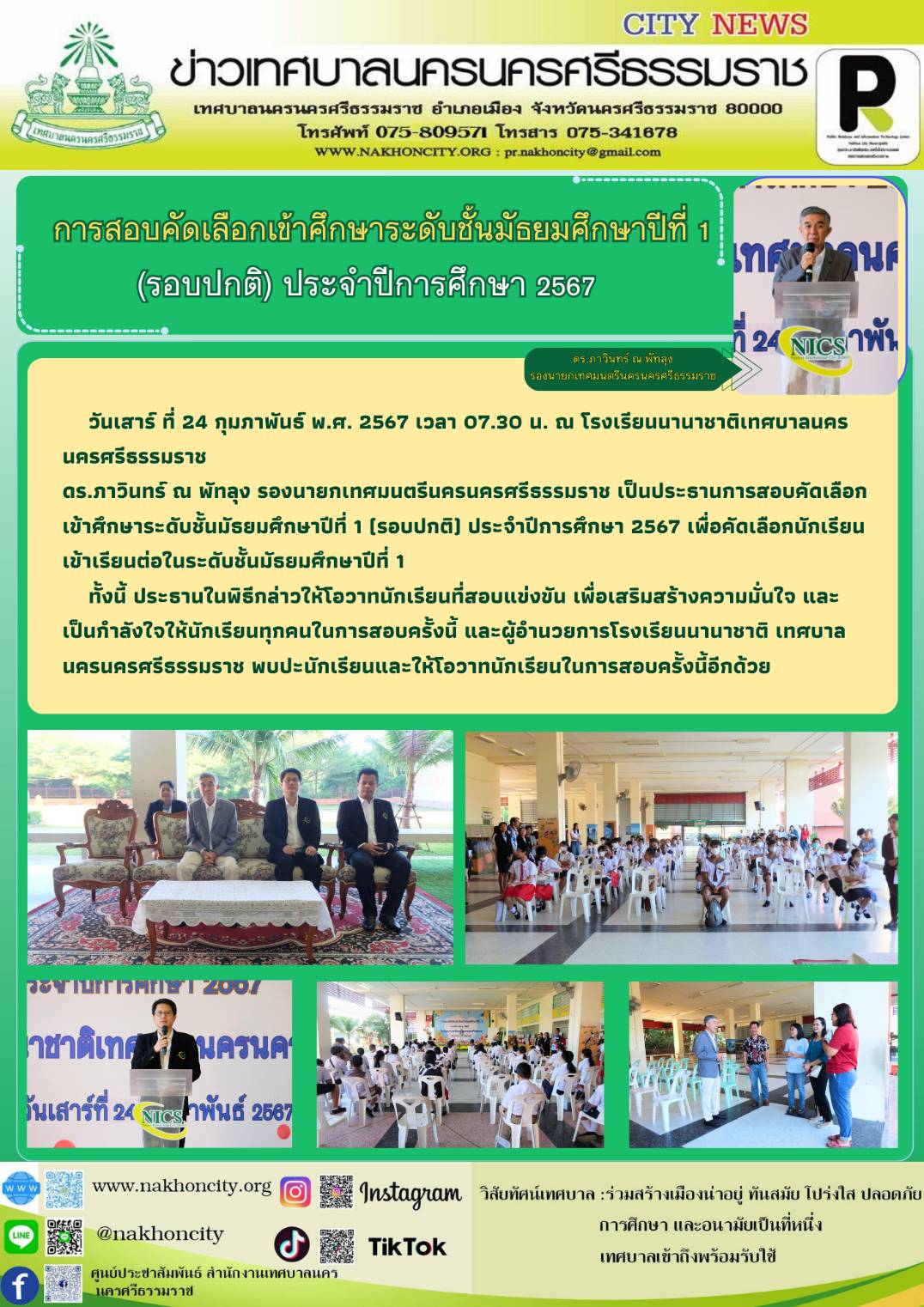 วันเสาร์ ที่ 24 กุมภาพันธ์ พ.ศ. 2567 เวลา 07.30 น. ณ โรงเรียนนานาชาติเทศบาลนครนครศรีธรรมราช ดร.ภาวินทร์ ณ พัทลุง รองนายกเทศมนตรีนครนครศรีธรรมราช เป็นประธานการสอบคัดเลือกเข้าศึกษาระดับชั้นมัธยมศึกษาปีที่ 1 (รอบปกติ) ประจำปีการศึกษา 2567 เพื่อคัดเลือกนักเรียนเข้าเรียนต่อในระดับชั้นมัธยมศึกษาปีที่ 1 ทั้งนี้ ประธานในพิธีกล่าวให้โอวาทนักเรียนที่สอบแข่งขัน เพื่อเสริมสร้างความมั่นใจ และเป็นกำลังใจให้นักเรียนทุกคนในการสอบครั้งนี้ และผู้อำนวยการโรงเรียนนานาชาติ เทศบาลนครนครศรีธรรมราช พบปะนักเรียนและให้โอวาทนักเรียนในการสอบครั้งนี้อีกด้วย ............ ภาพ//ข่าว//จันทร์จิรา |
