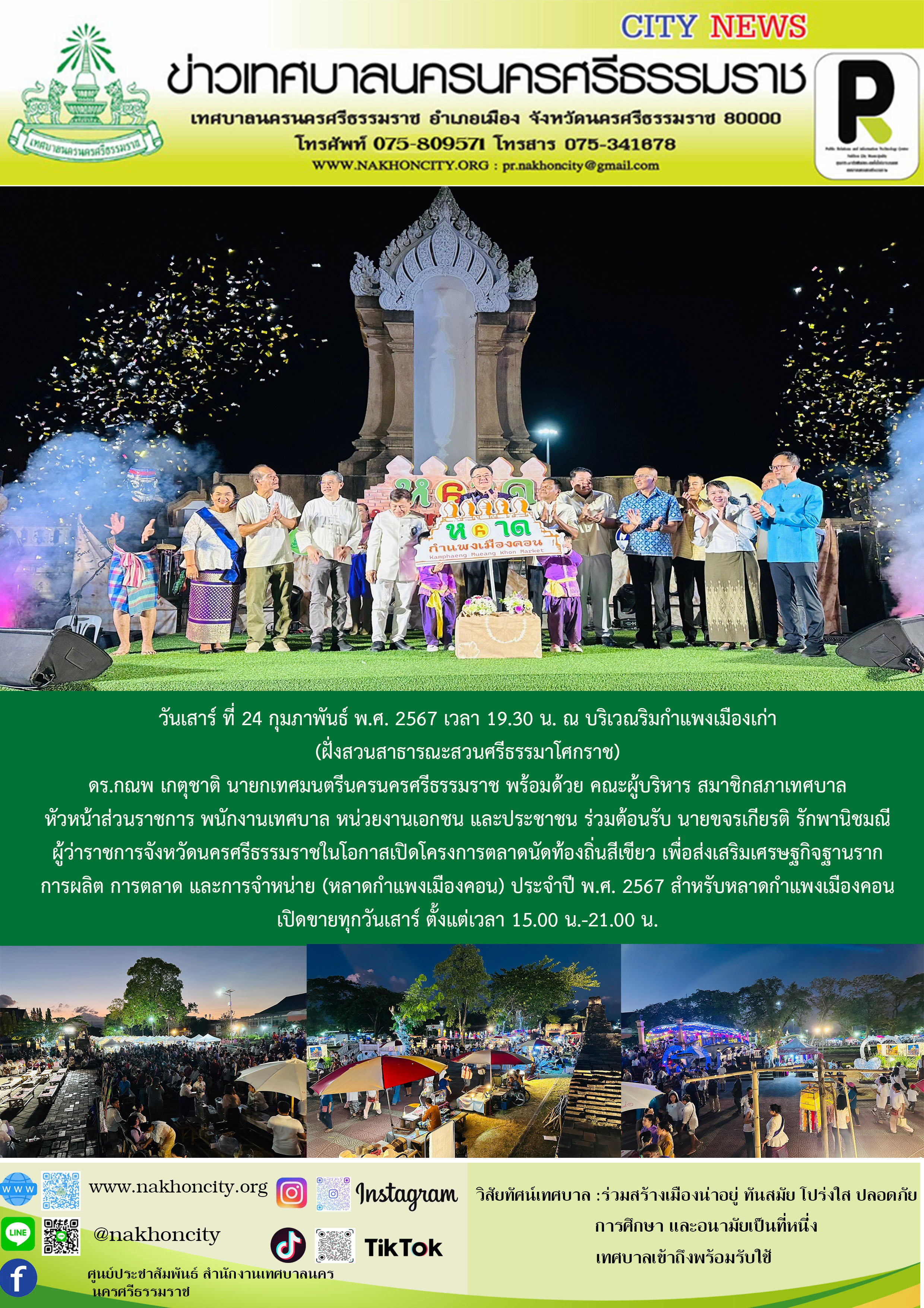ดร.กณพ เกตุชาติ นายกเทศมนตรีนครนครศรีธรรมราช พร้อมด้วย คณะผู้บริหาร สมาชิกสภาเทศบาล หัวหน้าส่วนราชการ พนักงานเทศบาล หน่วยงานเอกชน และประชาชน ร่วมต้อนรับ นายขจรเกียรติ รักพานิชมณี ผู้ว่าราชการจังหวัดนครศรีธรรมราชในโอกาสเปิดโครงการตลาดนัดท้องถิ่นสีเขียว (หลาดกำแพงเมืองคอน) |