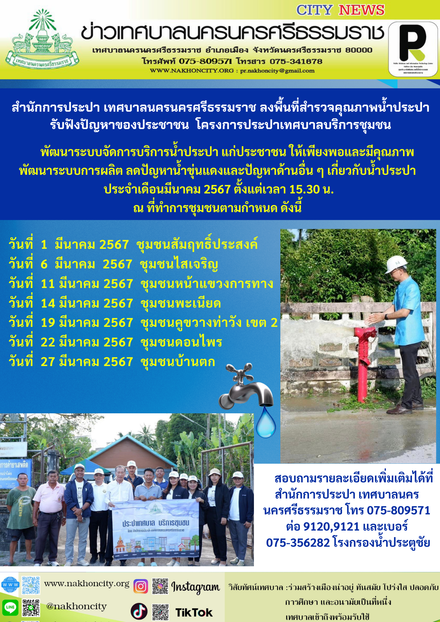 สำนักการประปา เทศบาลนครนครศรีธรรมราช พัฒนาระบบจัดการบริการน้ำประปาแก่ประชาชนให้เพียงพอและมีคุณภาพ พัฒนาระบบการผลิต ลดปัญหาน้ำขุ่นแดงและปัญหาด้านอื่น ๆ เกี่ยวกับน้ำประปา ลงพื้นที่สำรวจคุณภาพน้ำประปา รับฟังปัญหาต่าง ๆ เกี่ยวกับระบบประปา แบ่งเขตชุมชน จำนวน 67 ชุมชนประจำเดือนมีนาคม 2567 ตั้งแต่เวลา 15.30 น. ณ ที่ทำการชุมชนตามกำหนด ดังนี้ วันที่ 1 มีนาคม 2567 ชุมชนสัมฤทธิ์ประสงค์ วันที่ 6 มีนาคม 2567 ชุมชนไสเจริญ วันที่ 11 มีนาคม 2567 ชุมชนหน้าแขวงการทาง วันที่ 14 มีนาคม 2567 ชุมชนพะเนียด วันที่ 19 มีนาคม 2567 ชุมชนคูขวางท่าวัง เขต 2 วันที่ 22 มีนาคม 2567 ชุมชนดอนไพร วันที่ 27 มีนาคม 2567 ชุมชนบ้านตก สอบถามรายละเอียดเพิ่มเติมได้ที่ สำนักการประปา เทศบาลนครนครศรีธรรมราช โทร 075-809571 ต่อ 9120,9121 และเบอร์ 075-356282 โรงกรองน้ำประตูชัย