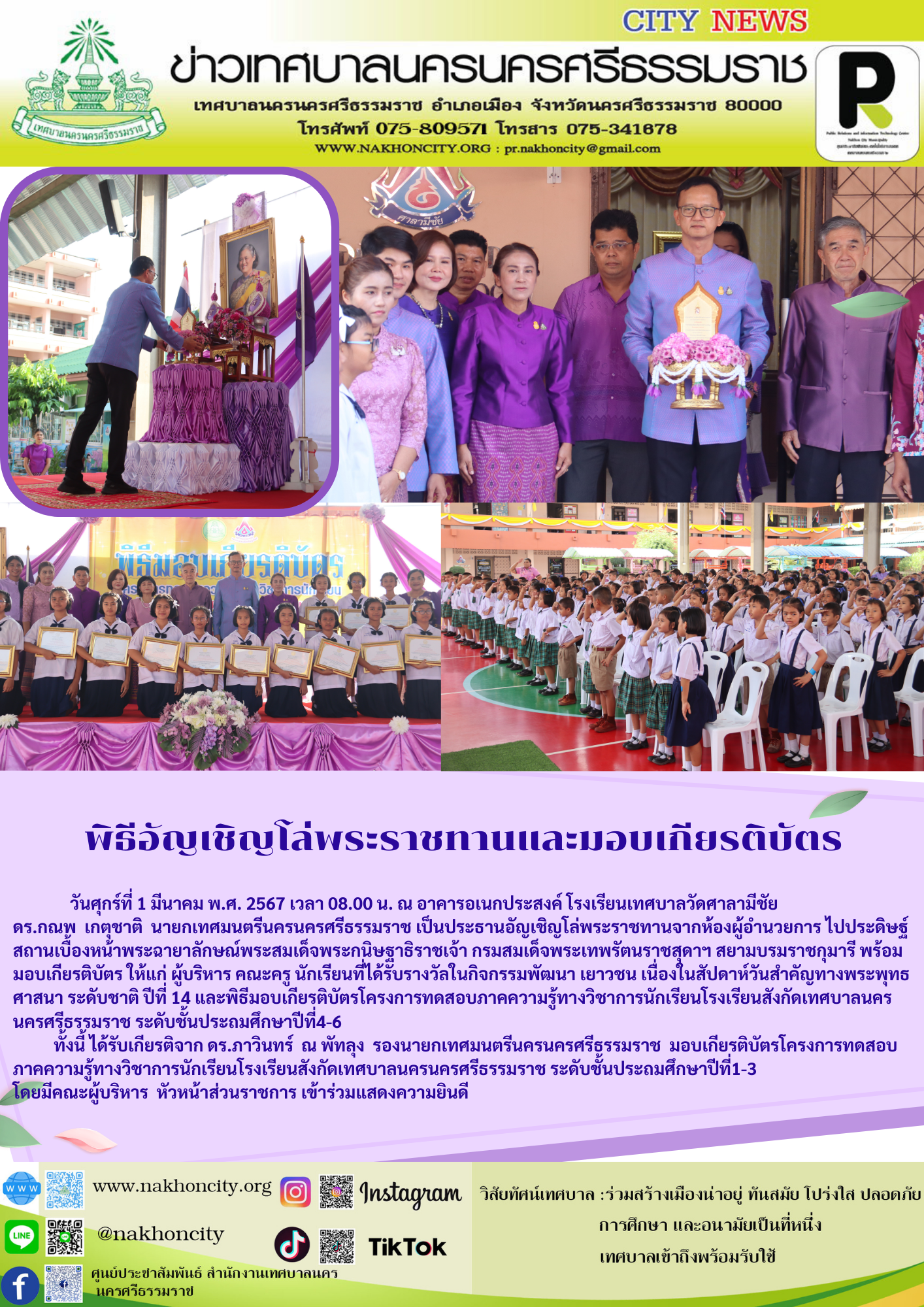 วันศุกร์ที่ 1 มีนาคม พ.ศ. 2567 เวลา 08.00 น. ณ อาคารอเนกประสงค์ โรงเรียนเทศบาลวัดศาลามีชัย ดร.กณพ เกตุชาติ นายกเทศมนตรีนครนครศรีธรรมราช เป็นประธานอัญเชิญโล่พระราชทานจากห้องผู้อำนวยการ ไปประดิษฐ์สถานเบื้องหน้าพระฉายาลักษณ์พระสมเด็จพระกนิษฐาธิราชเจ้า กรมสมเด็จพระเทพรัตนราชสุดาฯ สยามบรมราชกุมารี พร้อมมอบเกียรติบัตร ให้แก่ ผู้บริหาร คณะครู นักเรียนที่ได้รับรางวัลในกิจกรรมพัฒนา เยาวชน เนื่องในสัปดาห์วันสำคัญทางพระพุทธศาสนา ระดับชาติ ปีที่ 14 และพิธีมอบเกียรติบัตรโครงการทดสอบภาคความรู้ทางวิชาการนักเรียนโรงเรียนสังกัดเทศบาลนครนครศรีธรรมราช ระดับชั้นประถมศึกษาปีที่4-6 ทั้งนี้ ได้รับเกียรติจาก ดร.ภาวินทร์ ณ พัทลุง รองนายกเทศมนตรีนครนครศรีธรรมราช มอบเกียรติบัตรโครงการทดสอบภาคความรู้ทางวิชาการนักเรียนโรงเรียนสังกัดเทศบาลนครนครศรีธรรมราช ระดับชั้นประถมศึกษาปีที่1-3 โดยมีคณะผู้บริหาร หัวหน้าส่วนราชการ เข้าร่วมแสดงความยินดี