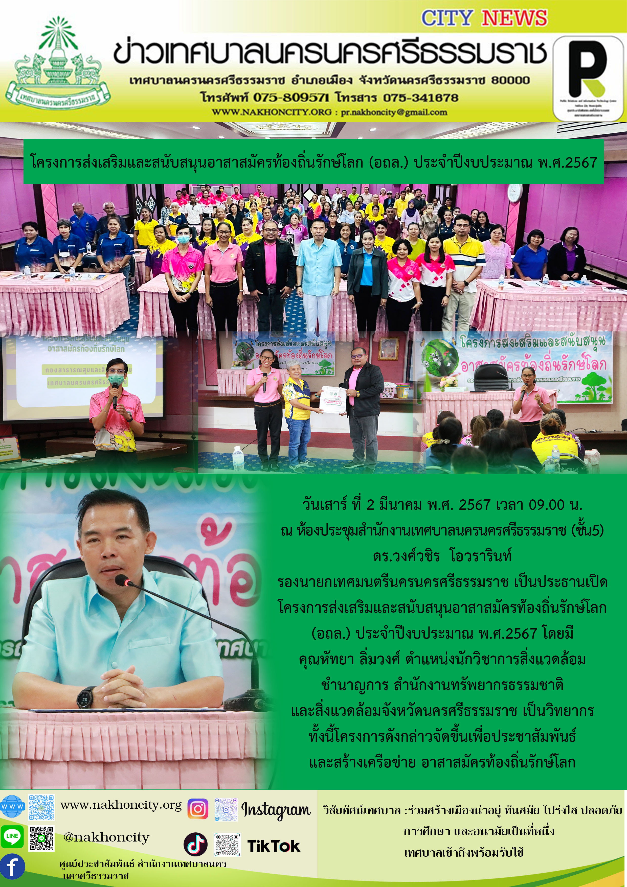ดร.วงศ์วชิร โอวรารินท์ รองนายกเทศมนตรีนครนครศรีธรรมราช เป็นประธานเปิด โครงการส่งเสริมและสนับสนุนอาสาสมัครท้องถิ่นรักษ์โลก (อถล.) ประจำปีงบประมาณ พ.ศ.2567 |