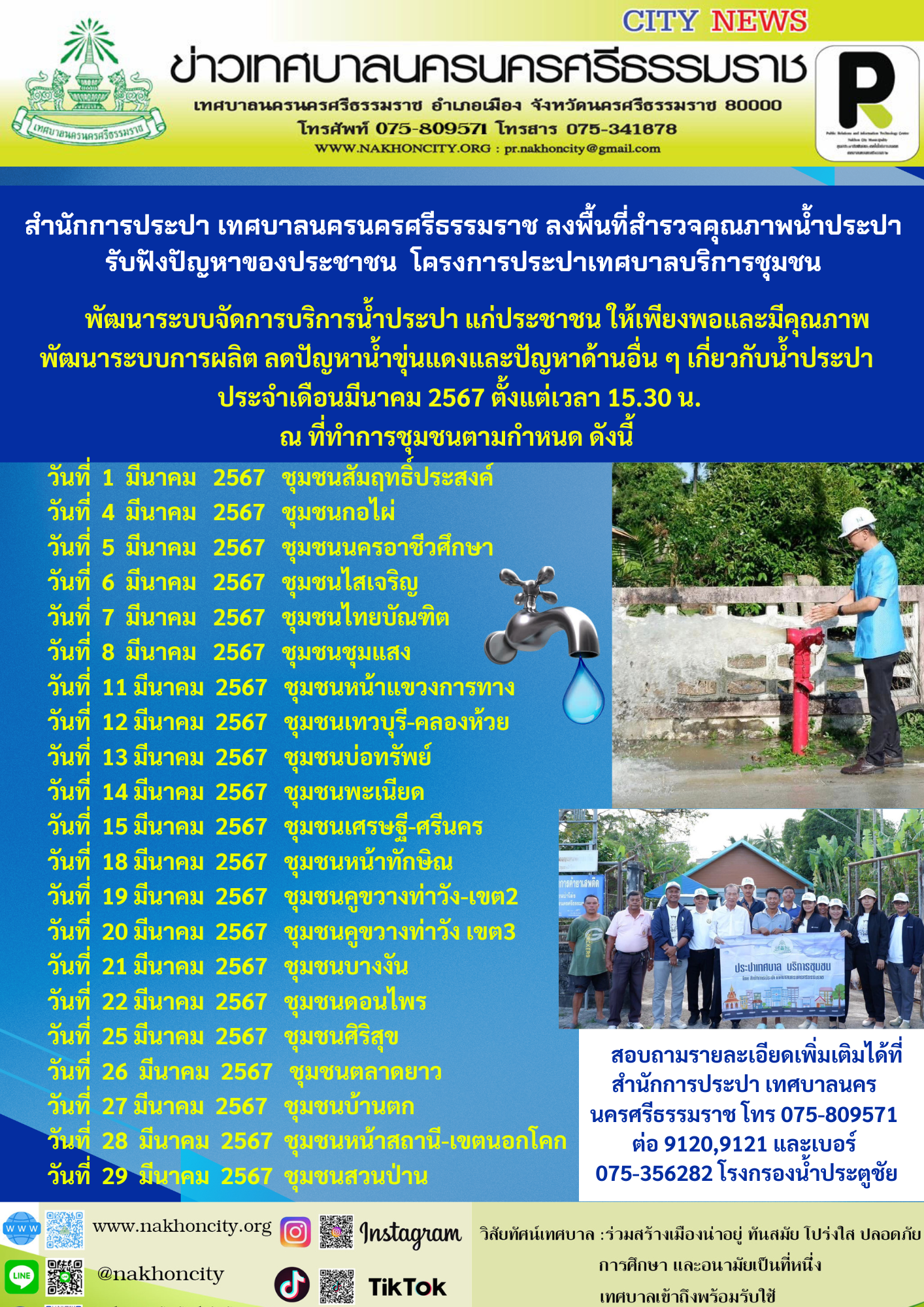 เทศบาลนครนครศรีธรรมราช ภายใต้การนำของ ดร.กณพ เกตุชาติ นายกเทศมนตรีนครนครศรีธรรมราช โดยสำนักการประปา เทศบาลนครนครศรีธรรมราช จัดทำโครงการประปาเทศบาลบริการชุมชน ประจำปีงบประมาณ 2567 สำนักการประปา เทศบาลนครนครศรีธรรมราช พัฒนาระบบจัดการบริการน้ำประปาแก่ประชาชนให้เพียงพอและมีคุณภาพ พัฒนาระบบการผลิต ลดปัญหาน้ำขุ่นแดงและปัญหาด้านอื่น ๆ เกี่ยวกับน้ำประปา ลงพื้นที่สำรวจคุณภาพน้ำประปา รับฟังปัญหาต่าง ๆ เกี่ยวกับระบบประปา แบ่งเขตชุมชน จำนวน 67 ชุมชนประจำเดือนมีนาคม 2567 ตั้งแต่เวลา 15.30 น. ณ ที่ทำการชุมชนตามกำหนด ดังนี้ วันที่ 1 มีนาคม 2567 ชุมชนสัมฤทธิ์ประสงค์ วันที่ 4 มีนาคม 2567 ชุมชนกอไผ่ วันที่ 5 มีนาคม 2567 ชุมชนนครอาชีวศึกษา วันที่ 6 มีนาคม 2567 ชุมชนไสเจริญ วันที่ 7 มีนาคม 2567 ชุมชนไทยบัณฑิต วันที่ 8 มีนาคม 2567 ชุมชนชุมแสง วันที่ 11 มีนาคม 2567 ชุมชนหน้าแขวงการทาง วันที่ 12 มีนาคม 2567 ชุมชนเทวบุรี-คลองห้วย วันที่ 13 มีนาคม 2567 ชุมชนบ่อทรัพย์ วันที่ 14 มีนาคม 2567 ชุมชนพะเนียด วันที่ 15 มีนาคม 2567 ชุมชนเศรษฐี-ศรีนคร วันที่ 18 มีนาคม 2567 ชุมชนหน้าทักษิณ วันที่ 19 มีนาคม 2567 ชุมชนคูขวางท่าวัง-เขต2 วันที่ 20 มีนาคม 2567 ชุมชนคูขวางท่าวัง เขต3 วันที่ 21 มีนาคม 2567 ชุมชนบางงัน วันที่ 22 มีนาคม 2567 ชุมชนดอนไพร วันที่ 25 มีนาคม 2567 ชุมชนศิริสุข วันที่ 26 มีนาคม 2567 ชุมชนตลาดยาว วันที่ 27 มีนาคม 2567 ชุมชนบ้านตก วันที่ 28 มีนาคม 2567 ชุมชนหน้าสถานี-เขตนอกโคก วันที่ 29 มีนาคม 2567 ชุมชนสวนป่าน