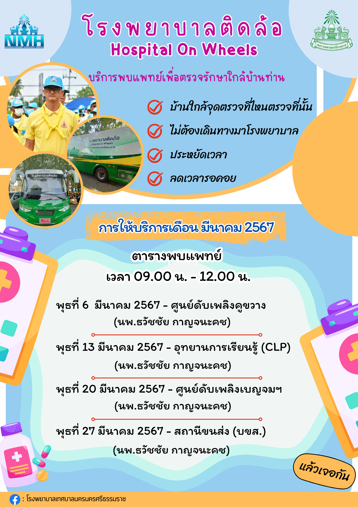 เทศบาลนครนครศรีธรรมราช ขอเชิญประชาชนเข้ารับบริการตรวจรักษาโรค โดยรถโรงพยาบาลติดล้อ วันพุธที่ 6 มีนาคม พ.ศ.2567 เวลา 09.00-12.00 น. ณ ศูนย์ดับเพลิงคูขวาง เทศบาลนครนครศรีธรรมราช ภายใต้การบริหารงานโดย ดร.กณพ เกตุชาติ นายกเทศมนตรีนครนครศรีธรรมราช เล็งเห็นถึงความสำคัญในการดูแลสุขภาพ การให้การรักษาพยาบาลประชาชนที่เจ็บป่วย ไม่สบาย จึงจัดให้มีการตรวจรักษาให้กับประชาชนใกล้บ้านในพื้นที่เขตเทศบาลนครนครศรีธรรมราช เพื่อให้ประชาชนได้รับบริการที่รวดเร็ว ประหยัดเวลา ลดเวลารอคอย ไม่ต้องเดินทางไปยังโรงพยาบาล บ้านใกล้ที่ไหนสามารถเข้ารับบริการได้ที่นั้น โดยประชาชนจะได้รับการตรวจรักษาจากแพทย์ พร้อมรับบริการจากทีมบุคลากรทางการแพทย์ ของโรงพยาบาลเทศบาลนครนครศรีธรรมราช โดย รถโรงพยาบาลติดล้อ จะออกหน่วยให้บริการตรวจรักษาประชาชนที่มีคิวนัด และประชาชนที่ต้องการตรวจโรคทั่วไป ทุกวันพุธ เวลา 09.00-12.00 น. ตามตารางปฏิบัติงาน สำหรับวันพุธที่ 6 มีนาคม พ.ศ.2567 กำหนดให้บริการ ณ ศูนย์ดับเพลิงคูขวาง ทั้งนี้ ขอให้ผู้เข้ารับบริการนำบัตรประจำตัวประชาชนมาด้วย สอบถามรายละเอียดเพิ่มเติมได้ที่ โรงพยาบาลเทศบาลนครนครศรีธรรมราช กองการแพทย์ โทรศัพท์ 075-340379 |