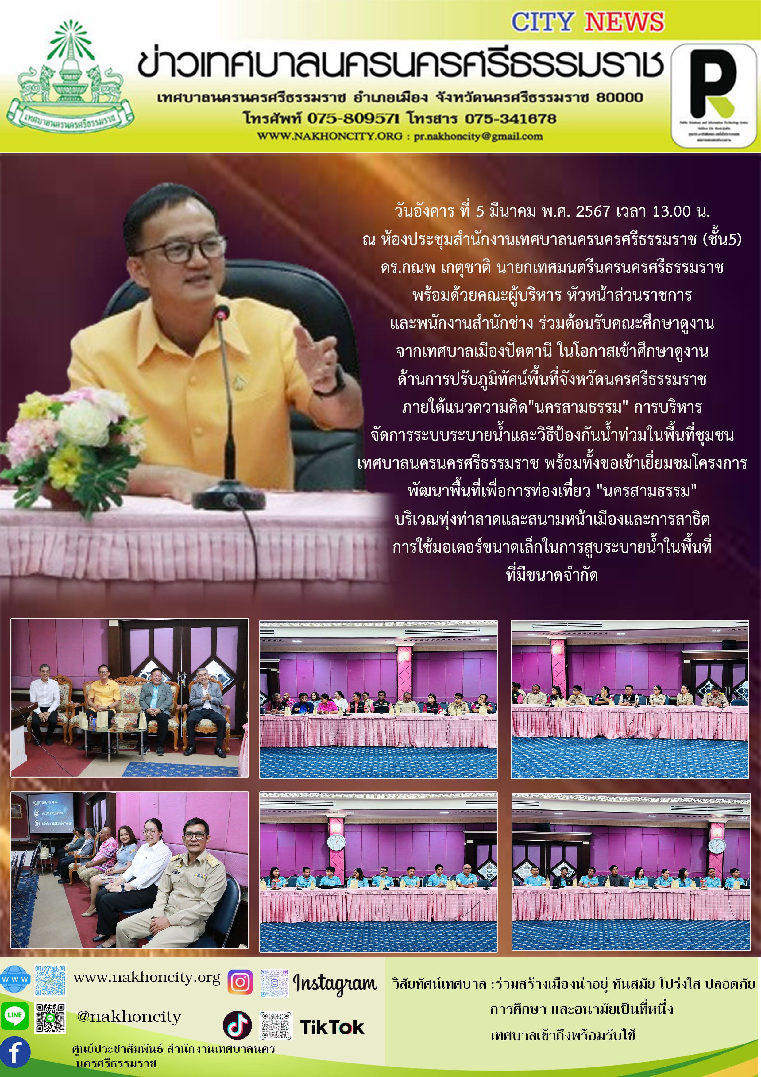 วันอังคาร ที่ 5 มีนาคม พ.ศ. 2567 เวลา 13.00 น. ณ ห้องประชุมสำนักงานเทศบาลนครนครศรีธรรมราช (ชั้น5) ดร.กณพ เกตุชาติ นายกเทศมนตรีนครนครศรีธรรมราช พร้อมด้วยคณะผู้บริหาร หัวหน้าส่วนราชการ และพนักงานสำนักช่าง ร่วมต้อนรับคณะศึกษาดูงาน จากเทศบาลเมืองปัตตานี ในโอกาสเข้าศึกษาดูงาน ด้านการปรับภูมิทัศน์พื้นที่จังหวัดนครศรีธรรมราช ภายใต้แนวความคิด"นครสามธรรม" การบริหาร จัดการระบบระบายน้ำและวิธีป้องกันน้ำท่วมในพื้นที่ชุมชน เทศบาลนครนครศรีธรรมราช พร้อมทั้งขอเข้าเยี่ยมชมโครงการ พัฒนาพื้นที่เพื่อการท่องเที่ยว "นครสามธรรม" บริเวณทุ่งท่าลาดและสนามหน้าเมืองและการสาธิต การใช้มอเตอร์ขนาดเล็กในการสูบระบายน้ำในพื้นที่ ที่มีขนาดจำกัด