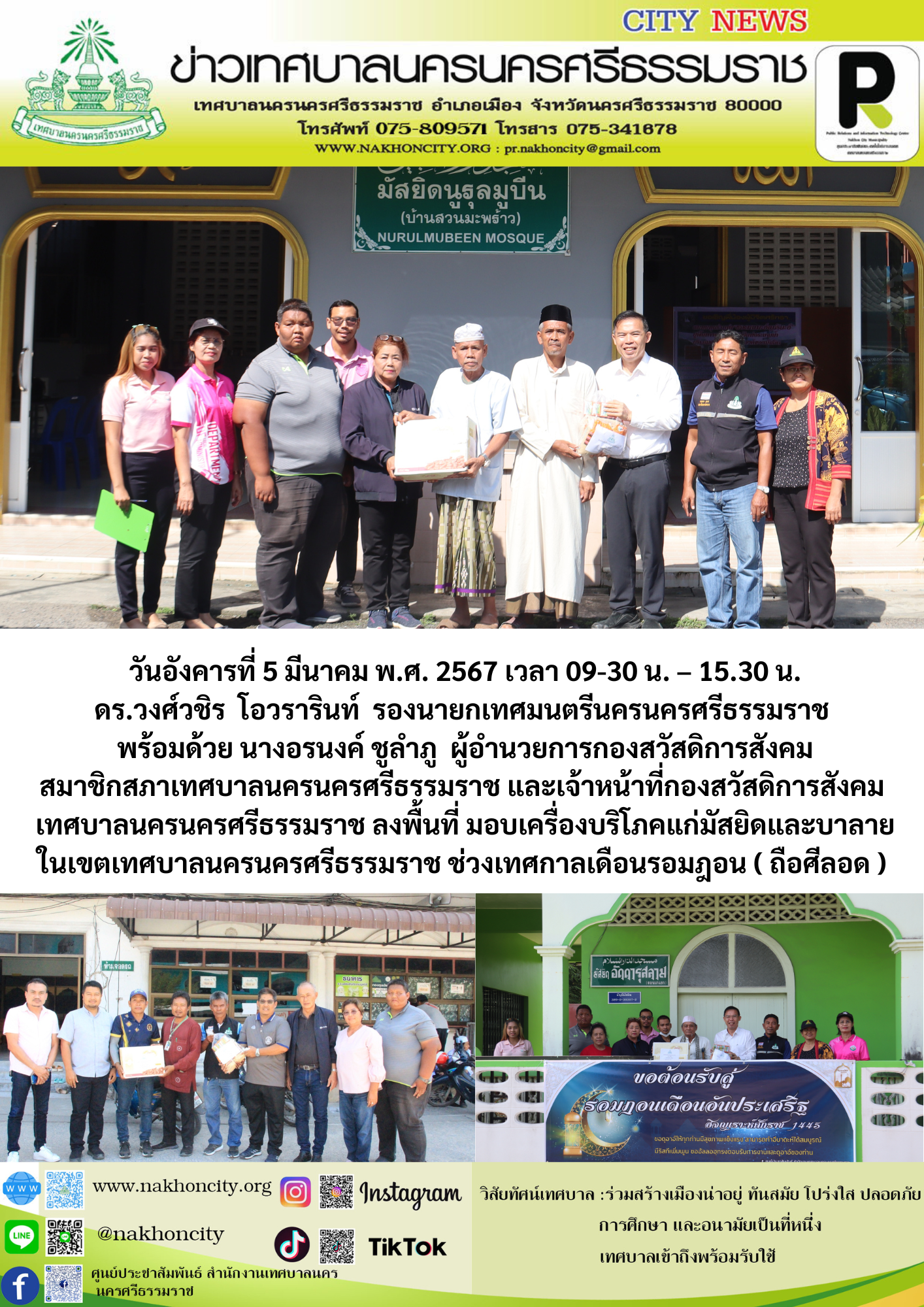วันอังคารที่ 5 มีนาคม พ.ศ. 2567 เวลา 09-30 น. – 15.30 น. ดร.วงศ์วชิร โอวรารินท์ รองนายกเทศมนตรีนครนครศรีธรรมราช พร้อมด้วย นางอรนงค์ ชูลำภู ผู้อำนวยการกองสวัสดิการสังคม สมาชิกสภาเทศบาลนครนครศรีธรรมราช และเจ้าหน้าที่กองสวัสดิการสังคม เทศบาลนครนครศรีธรรมราช ลงพื้นที่ มอบเครื่องบริโภคแก่มัสยิดและบาลาย ในเขตเทศบาลนครนครศรีธรรมราช ช่วงเทศกาลเดือนรอมฎอน ( ถือศีลอด ) |