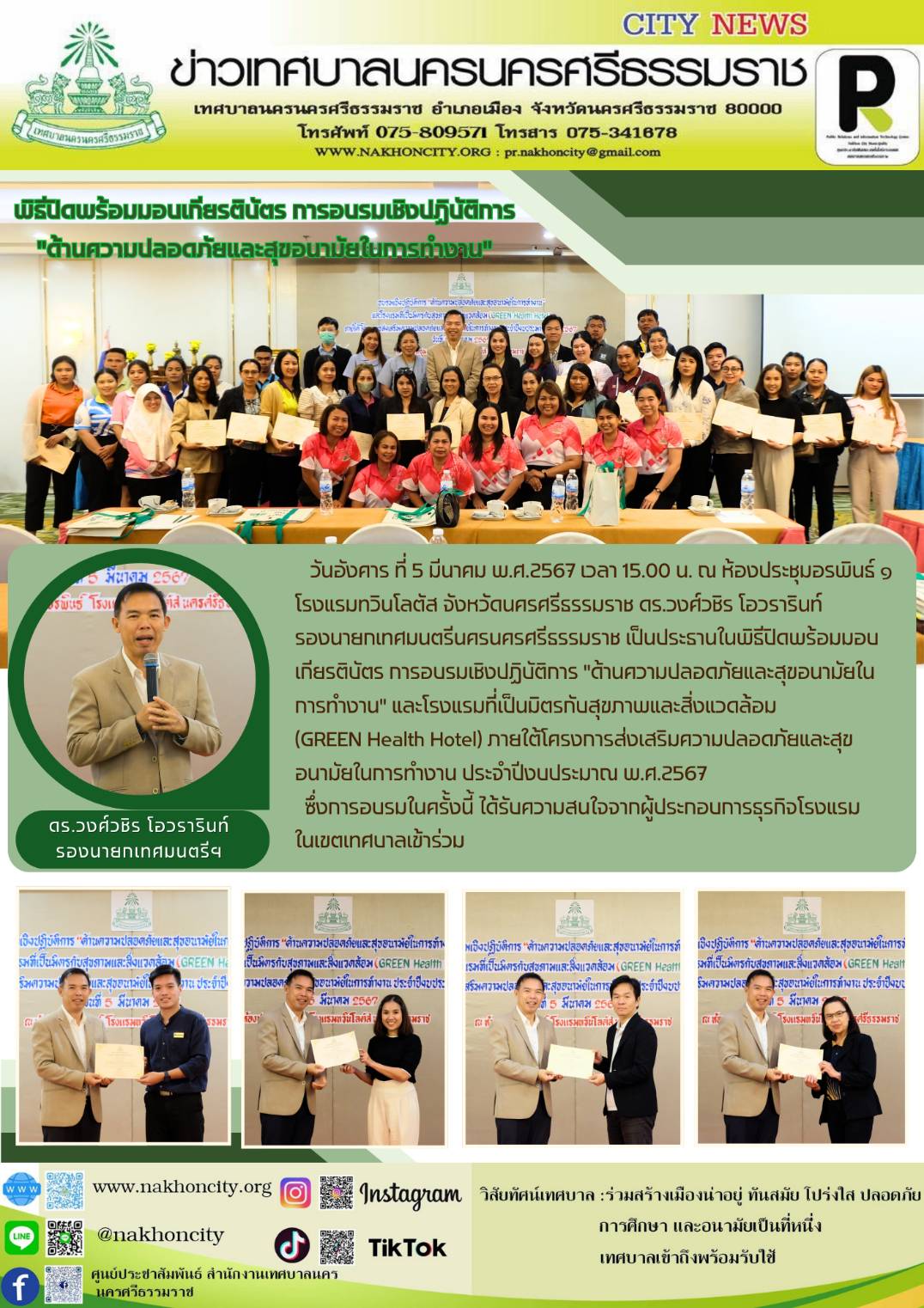 ดร.วงศ์วชิร โอวรารินท์ รองนายกเทศมนตรีนครนครศรีธรรมราช เป็นประธานในพิธีปิดอบรมเชิงปฏิบัติการ "ด้านความปลอดภัยและสุขอนามัยในการทำงาน" และโรงแรมที่เป็นมิตรกับสุขภาพและสิ่งแวดล้อม (GREEN Health Hotel) |