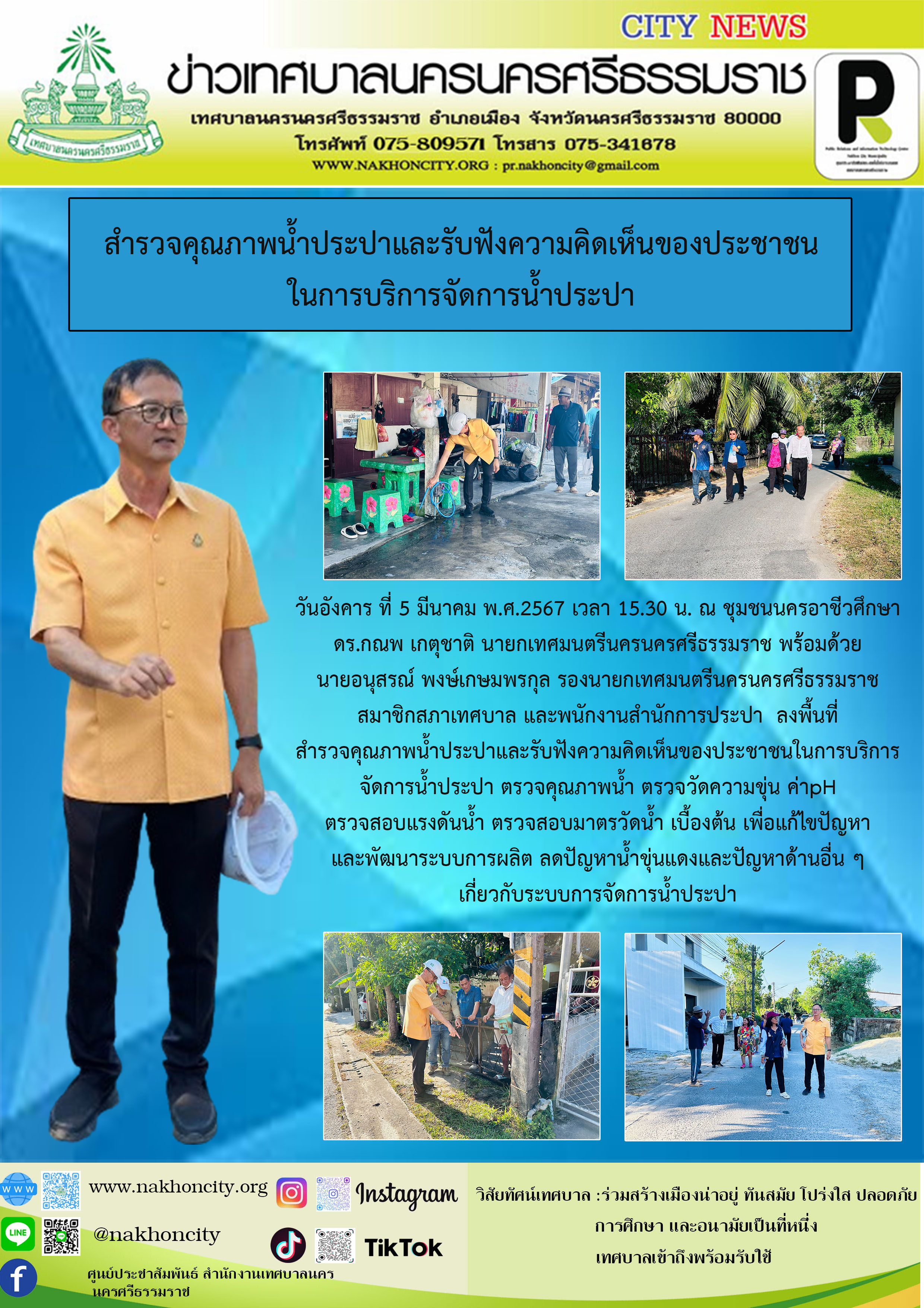 ดร.กณพ เกตุชาติ นายกเทศมนตรีนครนครศรีธรรมราชพร้อมด้วยนายอนุสรณ์ พงษ์เกษมพรกุล รองนายกเทศมนตรีนครนครศรีธรรมราช สมาชิกสภาเทศบาล และพนักงานสำนักการประปา ลงพื้นที่สำรวจคุณภาพน้ำประปาและรับฟังความคิดเห็นของประชาชนในการบริการจัดการน้ำประปา |