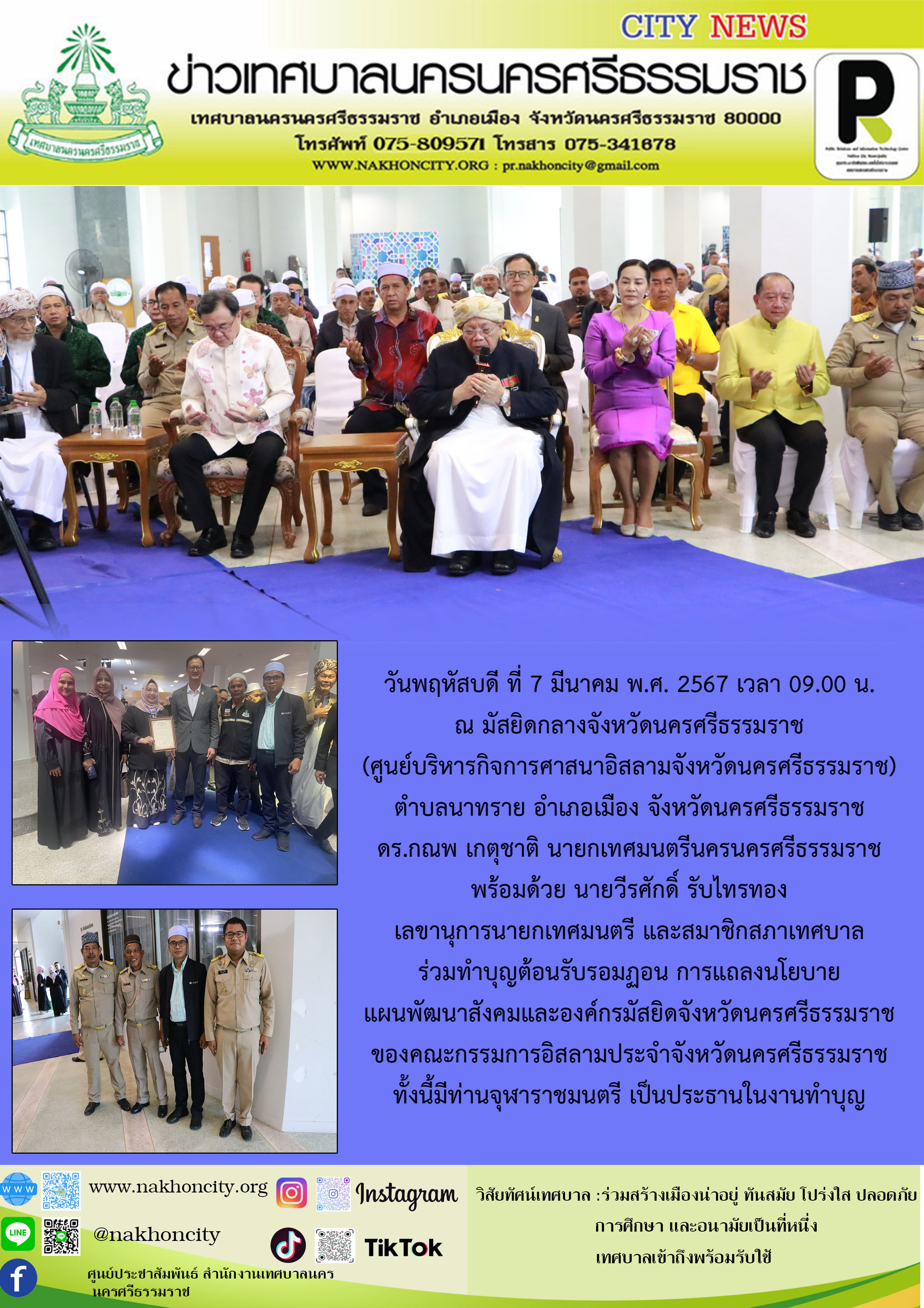 ดร.กณพ เกตุชาติ นายกเทศมนตรีนครนครศรีธรรมราช พร้อมด้วย นายวีรศักดิ์ รับไทรทอง เลขานุการนายกเทศมนตรี และสมาชิกสภาเทศบาล ร่วมทำบุญต้อนรับรอมฏอน การแถลงนโยบาย แผนพัฒนาสังคมและองค์กรมัสยิดจังหวัดนครศรีธรรมราช ของคณะกรรมการอิสลามประจำจังหวัดนครศรีธรรมราช |