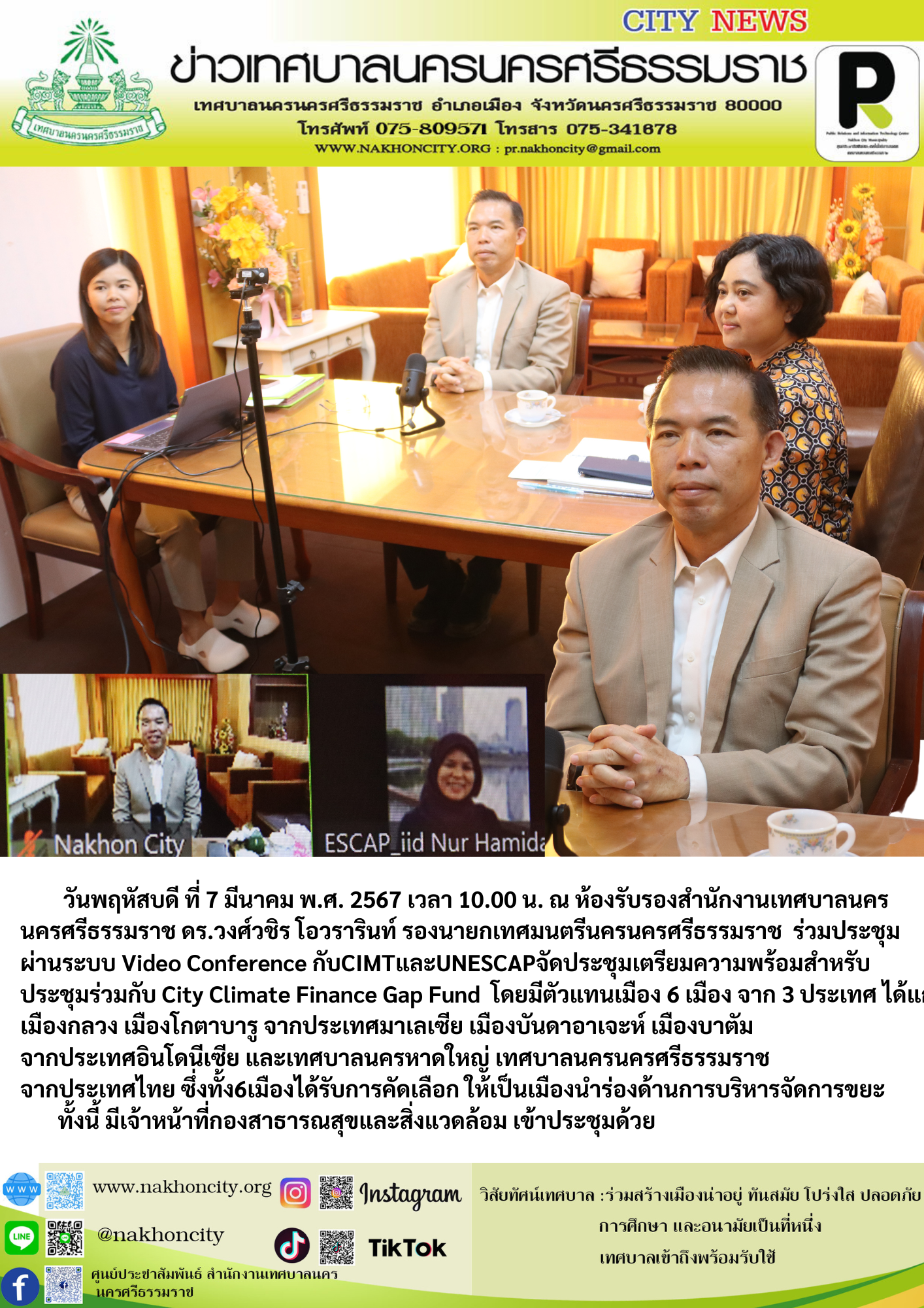 วันพฤหัสบดี ที่ 7 มีนาคม พ.ศ. 2567 เวลา 10.00 น. ณ ห้องรับรองสำนักงานเทศบาลนครนครศรีธรรมราช ดร.วงศ์วชิร โอวรารินท์ รองนายกเทศมนตรีนครนครศรีธรรมราช ร่วมประชุมผ่านระบบ Video Conference กับCIMTและUNESCAPจัดประชุมเตรียมความพร้อมสำหรับประชุมร่วมกับ City Climate Finance Gap Fund โดยมีตัวแทนเมือง 6 เมือง จาก 3 ประเทศ ได้แก่ เมืองกลวง เมืองโกตาบารู จากประเทศมาเลเซีย เมืองบันดาอาเจะห์ เมืองบาตัม จากประเทศอินโดนีเซีย และเทศบาลนครหาดใหญ่ เทศบาลนครนครศรีธรรมราช จากประเทศไทย ซึ่งทั้ง6เมืองได้รับการคัดเลือก ให้เป็นเมืองนำร่องด้านการบริหารจัดการขยะ ทั้งนี้ มีเจ้าหน้าที่กองสาธารณสุขและสิ่งแวดล้อม เข้าประชุมด้วย |