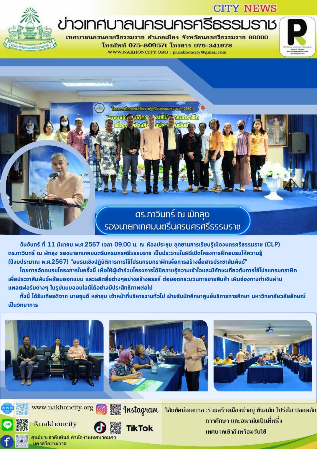 ดร.ภาวินทร์ ณ พัทลุง รองนายกเทศมนตรีนครนครศรีธรรมราช เป็นประธานในพิธีเปิดโครงการฝึกอบรมให้ความรู้ (ปีงบประมาณ พ.ศ.2567) "อบรมเชิงปฏิบัติการการใช้โปรแกรมกราฟิกเพื่อการสร้างสื่อสารประชาสัมพันธ์" |