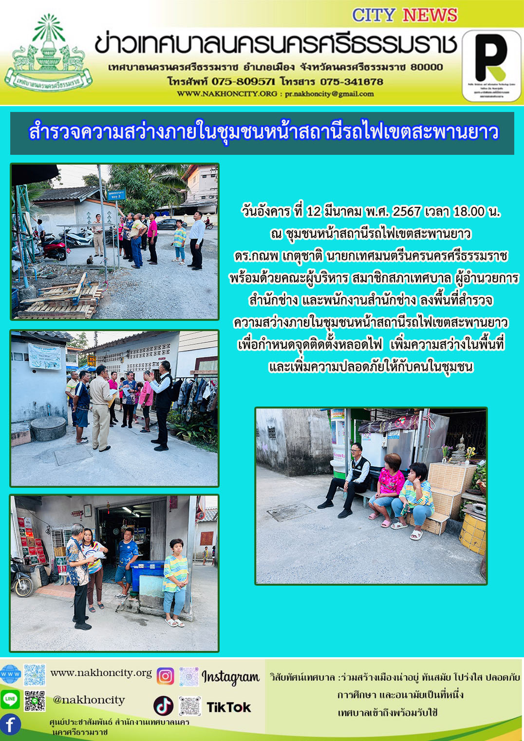ดร.กณพ เกตุชาติ นายกเทศมนตรีนครนครศรีธรรมราช พร้อมด้วยคณะผู้บริหาร สมาชิกสภาเทศบาล ผู้อำนวยการสำนักช่าง และพนักงานสำนักช่าง ลงพื้นที่สำรวจความสว่างภายในชุมชนหน้าสถานีรถไฟเขตสะพานยาว เพื่อกำหนดจุดติดตั้งหลอดไฟ เพิ่มความสว่างในพื้นที่ และเพิ่มความปลอดภัยให้กับคนในชุมชน |