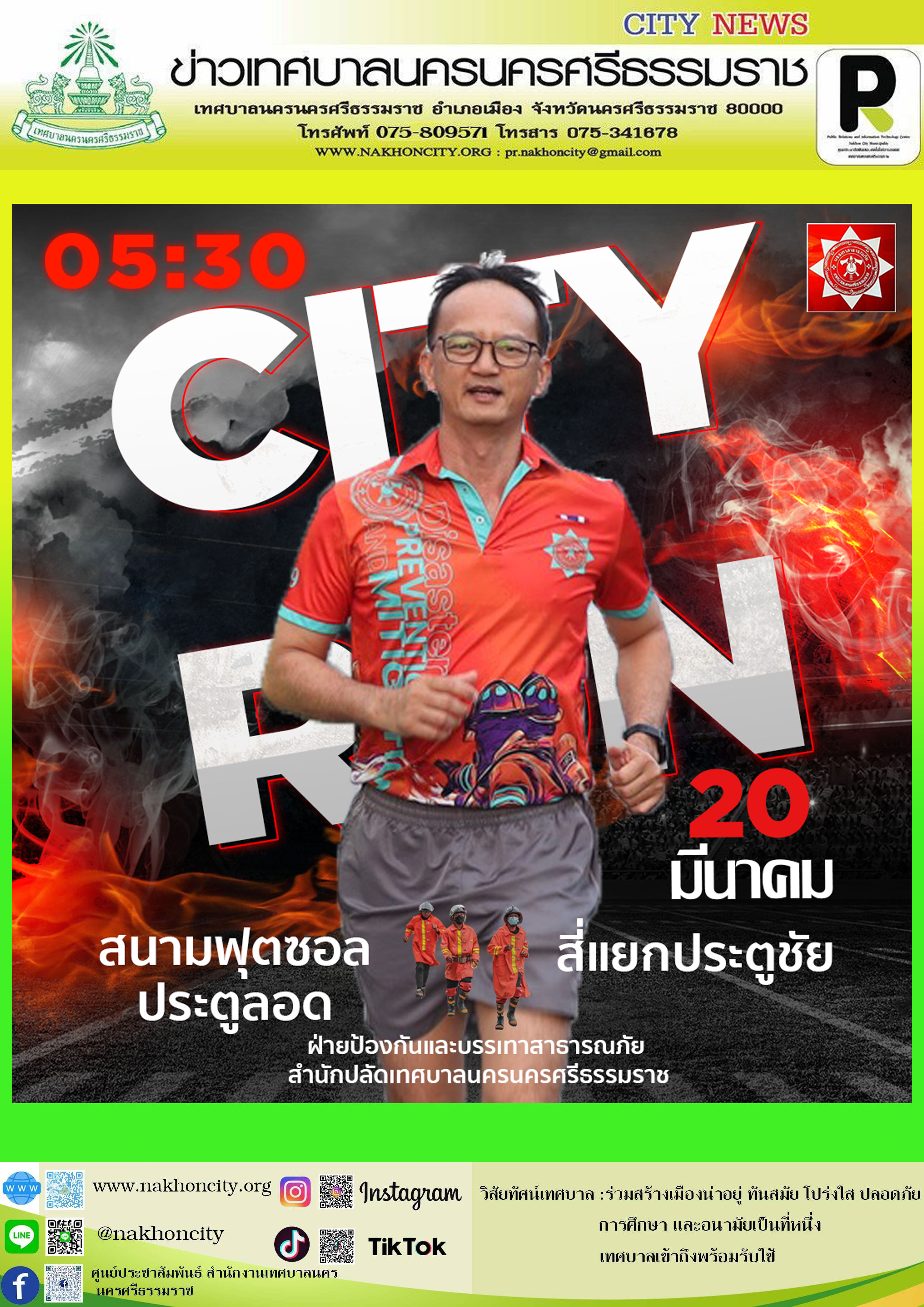 วิ่ง “City Run” วันพุธ วันพุธที่ 20 มีนาคม พ.ศ.2567 เวลา 05.30 น. ณ จุดนัดพบ สนามฟุตซอลประตูลอด |