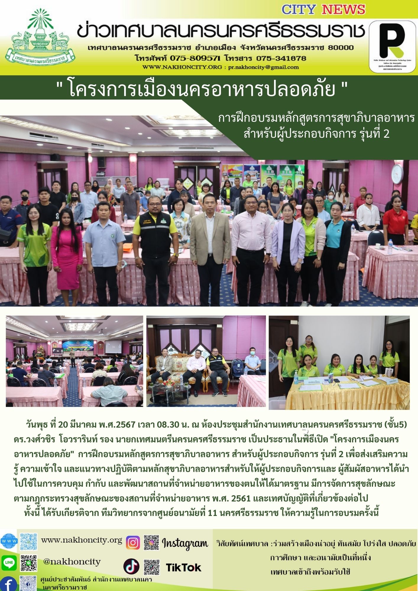 วันพุธ ที่ 20 มีนาคม พ.ศ.2567 เวลา 08.30 น. ณ ห้องประชุมสำนักงานเทศบาลนครนครศรีธรรมราช (ชั้น5) ดร.วงศ์วชิร โอวรารินท์ รอง นายกเทศมนตรีนครนครศรีธรรมราช เป็นประธานในพิธีเปิด "โครงการเมืองนครอาหารปลอดภัย" การฝึกอบรมหลักสูตรการสุขาภิบาลอาหาร สำหรับผู้ประกอบกิจการ รุ่นที่ 2 เพื่อส่งเสริมความรู้ ความเข้าใจ และแนวทางปฏิบัติตามหลักสุขาภิบาลอาหารสำหรับให้ผู้ประกอบกิจการและ ผู้สัมผัสอาหารได้นำไปใช้ในการควบคุม กำกับ และพัฒนาสถานที่จำหน่ายอาหารของตนให้ได้มาตรฐาน มีการจัดการสุขลักษณะตามกฎกระทรวงสุขลักษณะของสถานที่จำหน่ายอาหาร พ.ศ. 2561 และเทศบัญญัติที่เกี่ยวข้องต่อไป ทั้งนี้ ได้รับเกียรติจาก ทีมวิทยากรจากศูนย์อนามัยที่ 11 นครศรีธรรมราช ให้ความรู้ในการอบรมครั้งนี้ |