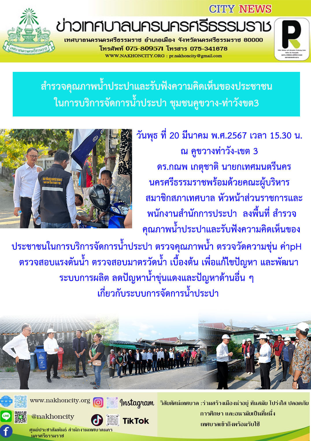 ดร.กณพ เกตุชาติ นายกเทศมนตรีนครนครศรีธรรมราชพร้อมด้วยคณะผู้บริหาร สมาชิกสภาเทศบาล และพนักงานสำนักการประปา ลงพื้นที่ สำรวจคุณภาพน้ำประปาและรับฟังความคิดเห็นของประชาชนในการบริการจัดการน้ำประปา |
