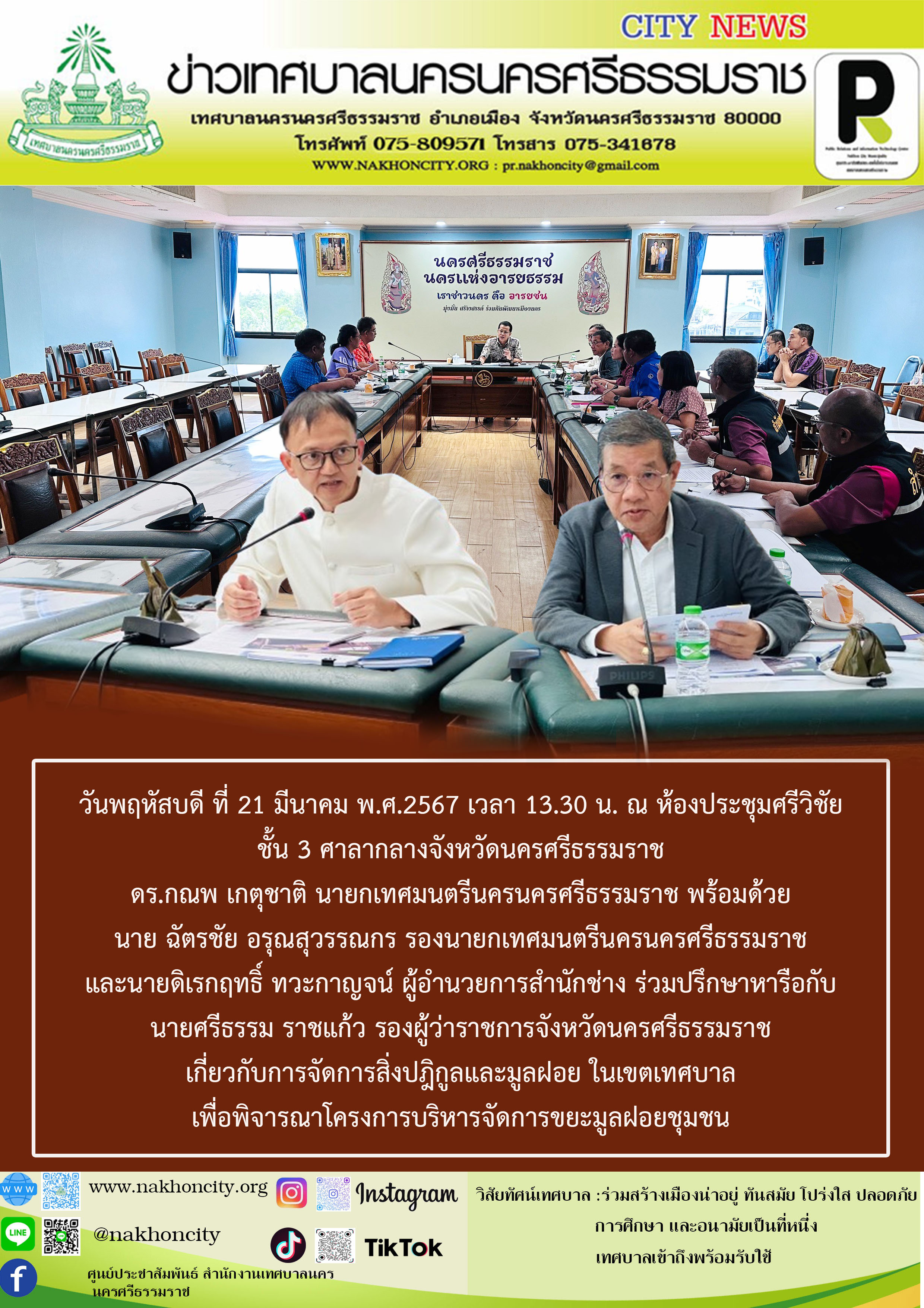 ดร.กณพ เกตุชาติ นายกเทศมนตรีนครนครศรีธรรมราช ร่วมปรึกษาหารือกับนายศรีธรรม ราชแก้ว รองผู้ว่าราชการจังหวัดนครศรีธรรมราช เกี่ยวกับการจัดการสิ่งปฎิกูลและมูลฝอย ในเขตเทศบาล |