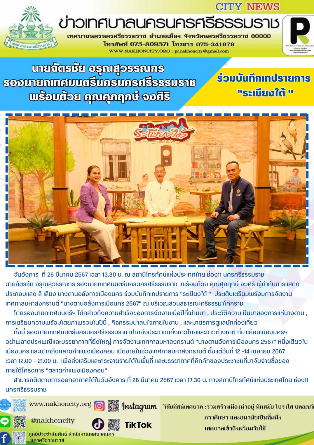 วันอังคาร ที่ 26 มีนาคม 2567 เวลา 13.30 น. ณ สถานีโทรทัศน์แห่งประเทศไทย ช่อง11 นครศรีธรรมราช นายฉัตรชัย อรุณสุวรรณกร รองนายกเทศมนตรีนครนครศรีธรรมราช พร้อมด้วย คุณศุภฤกษ์ จงศิริ ผู้กำกับการแสดงประกอบแสง สี เสียง นางดานอลังการเมืองนคร ร่วมบันทึกเทปรายการ "ระเบียงใต้ " ประเด็นเตรียมพร้อมการจัดงานเทศกาลมหาสงกรานต์ "นางดานอลังการเมือนคร 2567" ณ บริเวณสวนสธารณะศรีธรรมาโศกราช |