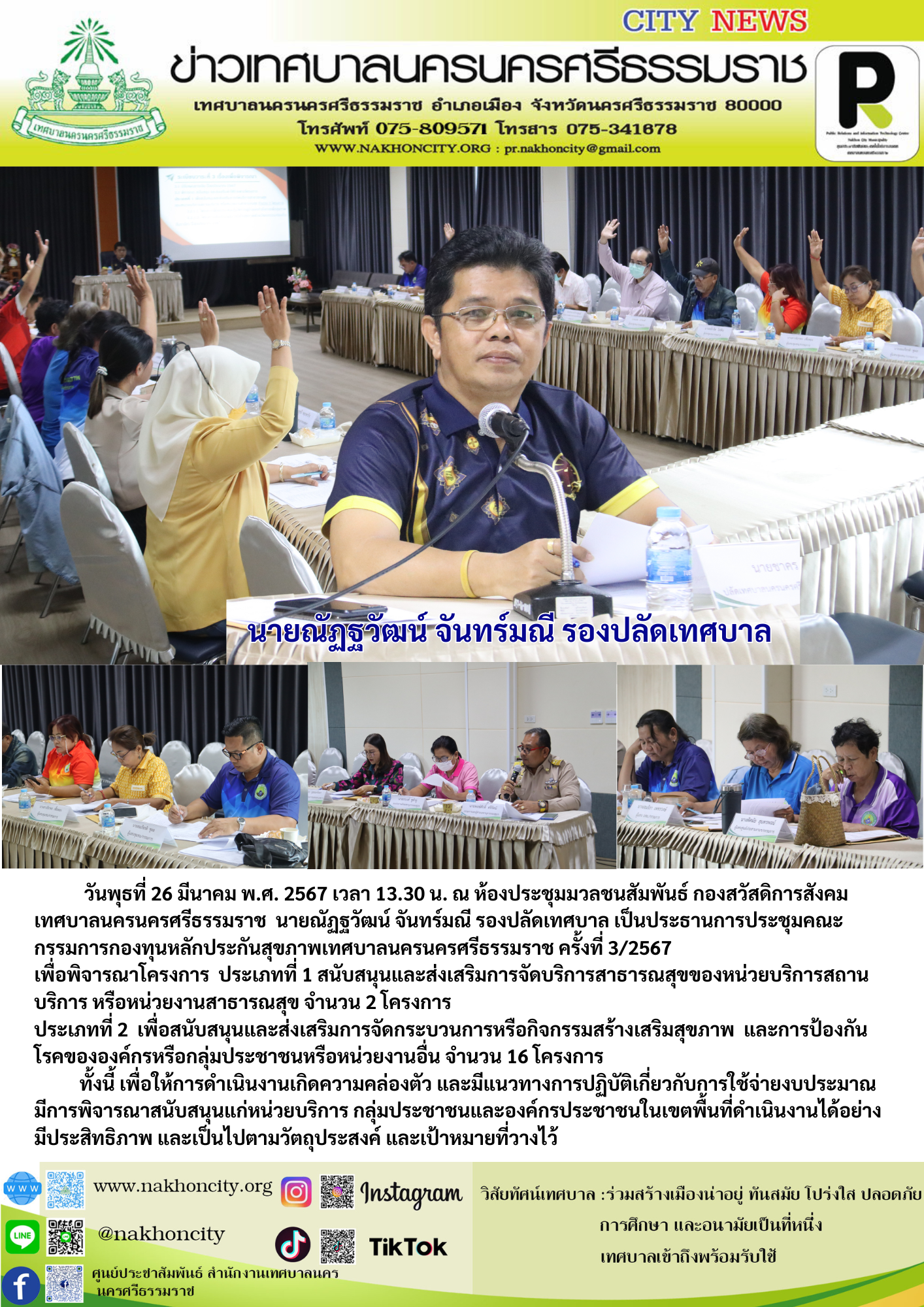นายณัฏฐวัฒน์ จันทร์มณี รองปลัดเทศบาล เป็นประธานการประชุมคณะกรรมการกองทุนหลักประกันสุขภาพเทศบาลนครนครศรีธรรมราช ครั้งที่ 3/2567 |