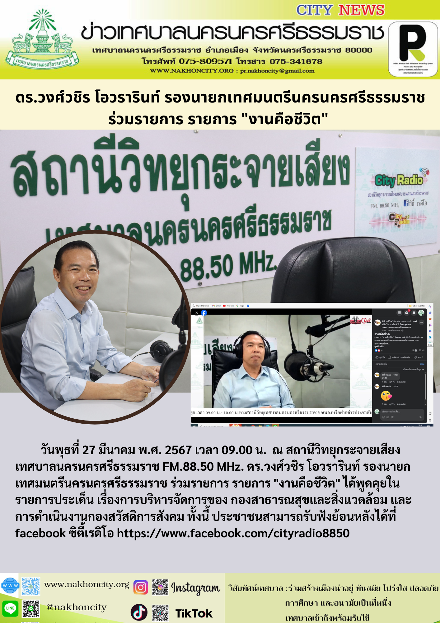 วันพุธที่ 27 มีนาคม พ.ศ. 2567 เวลา 09.00 น. ณ สถานีวิทยุกระจายเสียง เทศบาลนครนครศรีธรรมราช FM.88.50 MHz. ดร.วงศ์วชิร โอวรารินท์ รองนายกเทศมนตรีนครนครศรีธรรมราช ร่วมรายการ รายการ "งานคือชีวิต" ได้พูดคุยในรายการประเด็น เรื่องการบริหารจัดการของ กองสาธารณสุขและสิ่งแวดล้อม และการดำเนินงานกองสวัสดิการสังคม ทั้งนี้ ประชาชนสามารถรับฟังย้อนหลังได้ที่ facebook ซิตี้เรดิโอ https://www.facebook.com/cityradio8850