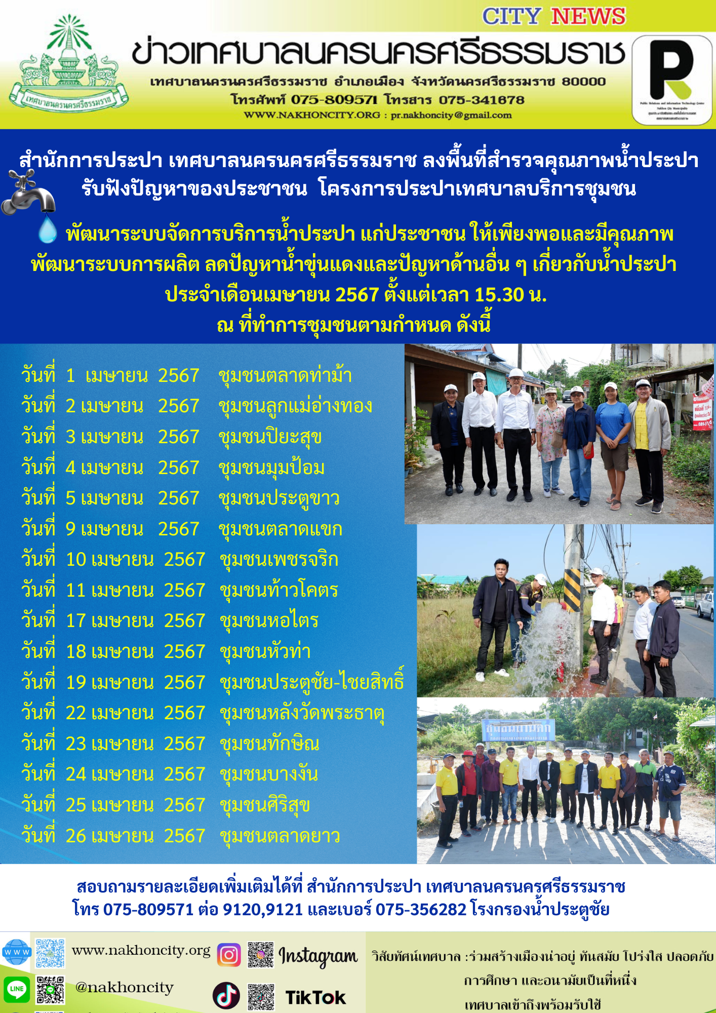 เทศบาลนครนครศรีธรรมราช ภายใต้การนำของ ดร.กณพ เกตุชาติ นายกเทศมนตรีนครนครศรีธรรมราช โดยสำนักการประปา เทศบาลนครนครศรีธรรมราช จัดทำโครงการประปาเทศบาลบริการชุมชน ประจำปีงบประมาณ 2567 สำนักการประปา เทศบาลนครนครศรีธรรมราช พัฒนาระบบจัด การบริการน้ำประปาแก่ประชาชนให้เพียงพอและมีคุณภาพ พัฒนาระบบการผลิต ลดปัญหาน้ำขุ่นแดงและปัญหาด้านอื่น ๆ เกี่ยวกับน้ำประปา ลงพื้นที่สำรวจคุณภาพน้ำประปา รับฟังปัญหาต่าง ๆ เกี่ยวกับระบบประปา แบ่งเขตชุมชน จำนวน 67 ชุมชนประจำเดือนเมษายน 2567 ตั้งแต่เวลา 15.30 น. ณ ที่ทำการชุมชนตามกำหนด ดังนี้ วันที่ 1 เมษายน 2567 ชุมชนตลาดท่าม้า วันที่ 2 เมษายน 2567 ชุมชนลูกแม่อ่างทอง วันที่ 3 เมษายน 2567 ชุมชนปิยะสุข วันที่ 4 เมษายน 2567 ชุมชนมุมป้อม วันที่ 5 เมษายน 2567 ชุมชนประตูขาว วันที่ 9 เมษายน 2567 ชุมชนตลาดแขก วันที่ 10 เมษายน 2567 ชุมชนเพชรจริก วันที่ 11 เมษายน 2567 ชุมชนท้าวโคตร วันที่ 17 เมษายน 2567 ชุมชนหอไตร วันที่ 18 เมษายน 2567 ชุมชนหัวท่า วันที่ 19 เมษายน 2567 ชุมชนประตูชัย-ไชยสิทธิ์ วันที่ 22 เมษายน 2567 ชุมชนหลังวัดพระธาตุ วันที่ 23 เมษายน 2567 ชุมชนทักษิณ วันที่ 24 เมษายน 2567 ชุมชนบางงัน วันที่ 25 เมษายน 2567 ชุมชนศิริสุข วันที่ 26 เมษายน 2567 ชุมชนตลาดยาว