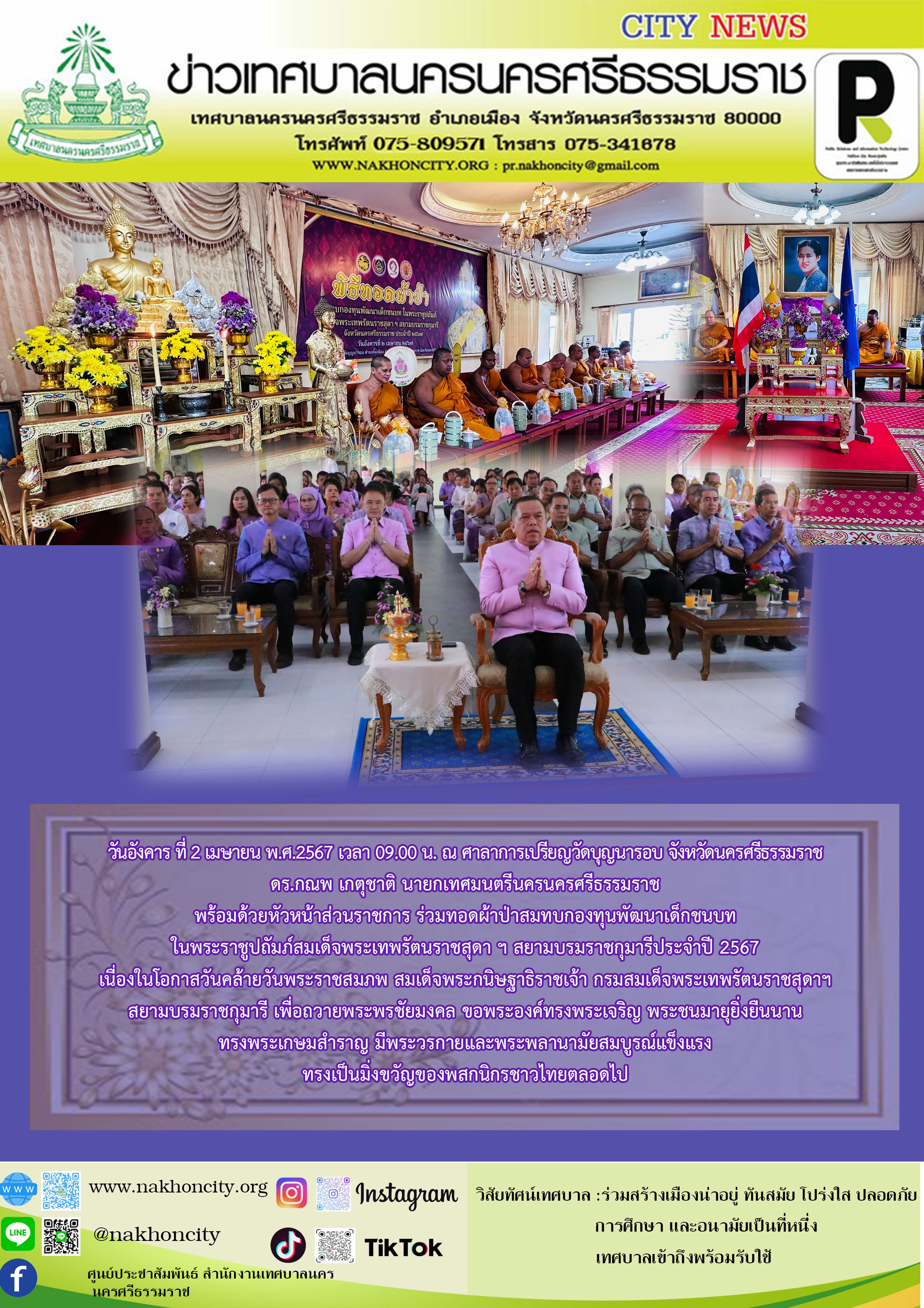 ดร.กณพ เกตุชาติ นายกเทศมนตรีนครนครศรีธรรมราช พร้อมด้วยหัวหน้าส่วนราชการ ร่วมทอดผ้าป่าสมทบกองทุนพัฒนาเด็กชนบท ในพระราชูปถัมภ์สมเด็จพระเทพรัตนราชสุดา ฯ สยามบรมราชกุมารี ประจำปี 2567 |