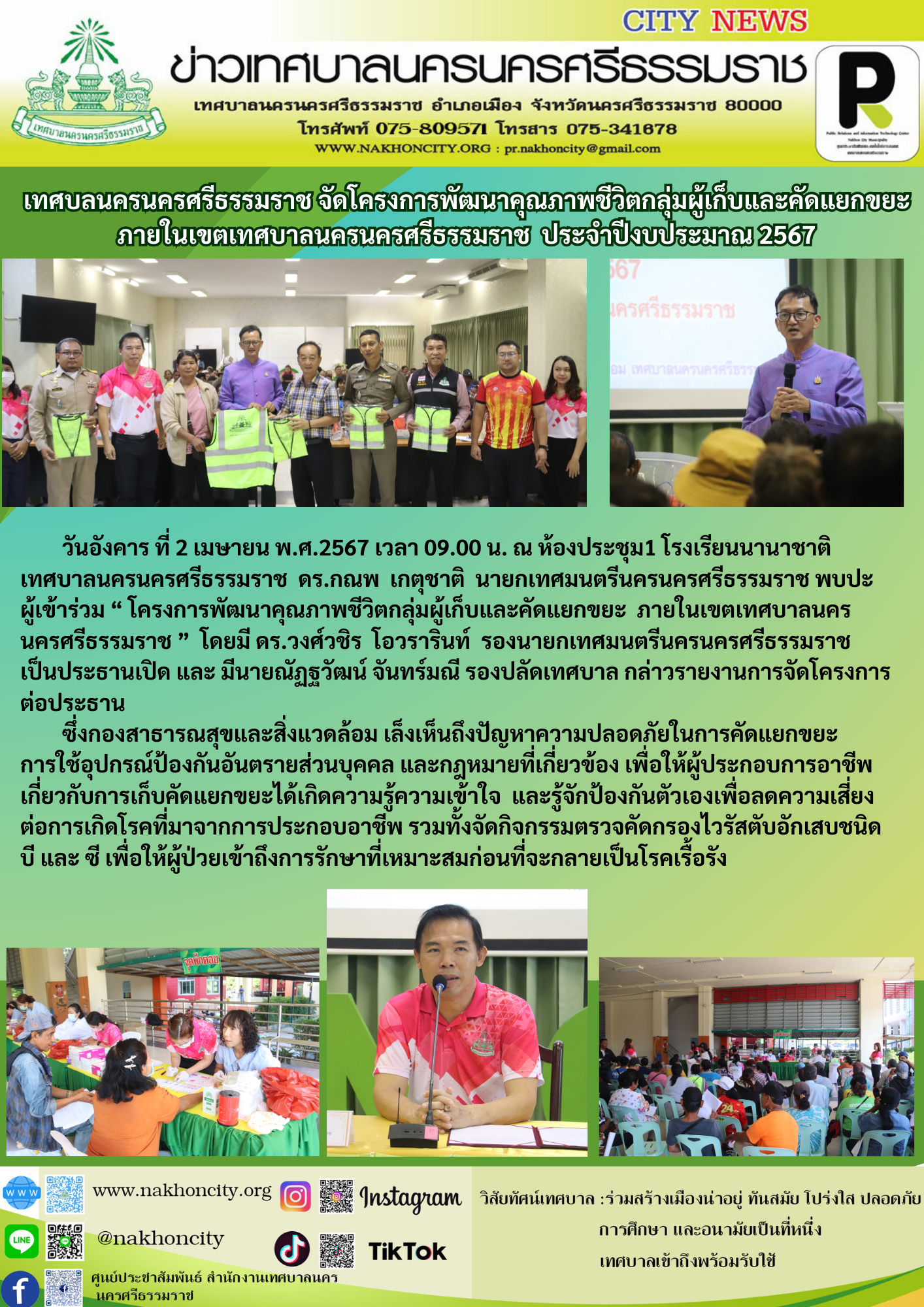 วันอังคาร ที่ 2 เมษายน พ.ศ.2567 เวลา 09.00 น. ณ ห้องประชุม1 โรงเรียนนานาชาติเทศบาลนครนครศรีธรรมราช ดร.กณพ เกตุชาติ นายกเทศมนตรีนครนครศรีธรรมราช พบปะผู้เข้าร่วม “ โครงการพัฒนาคุณภาพชีวิตกลุ่มผู้เก็บและคัดแยกขยะ ภายในเขตเทศบาลนครนครศรีธรรมราช ” โดยมี ดร.วงศ์วชิร โอวรารินท์ รองนายกเทศมนตรีนครนครศรีธรรมราช เป็นประธานเปิด และ มีนายณัฏฐวัฒน์ จันทร์มณี รองปลัดเทศบาล กล่าวรายงานการจัดโครงการต่อประธาน ซึ่งกองสาธารณสุขและสิ่งแวดล้อม เล็งเห็นถึงปัญหาความปลอดภัยในการคัดแยกขยะ การใช้อุปกรณ์ป้องกันอันตรายส่วนบุคคล และกฎหมายที่เกี่ยวข้อง เพื่อให้ผู้ประกอบการอาชีพเกี่ยวกับการเก็บคัดแยกขยะได้เกิดความรู้ความเข้าใจ และรู้จักป้องกันตัวเองเพื่อลดความเสี่ยงต่อการเกิดโรคที่มาจากการประกอบอาชีพ รวมทั้งจัดกิจกรรมตรวจคัดกรองไวรัสตับอักเสบชนิดบี และ ซี เพื่อให้ผู้ป่วยเข้าถึงการรักษาที่เหมาะสมก่อนที่จะกลายเป็นโรคเรื้อรัง