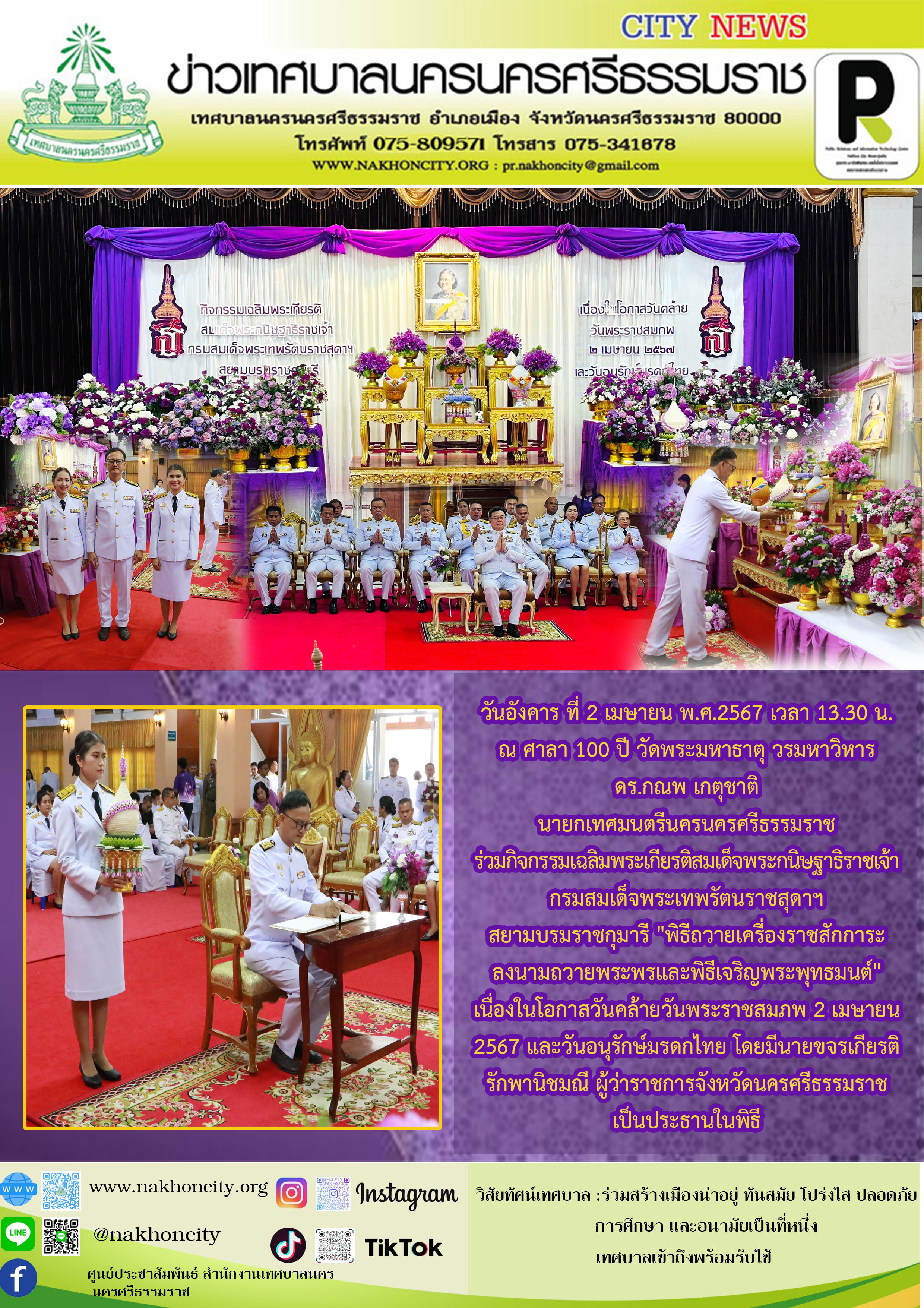 ดร.กณพ เกตุชาติ นายกเทศมนตรีนครนครศรีธรรมราช ร่วมกิจกรรมเฉลิมพระเกียรติสมเด็จพระกนิษฐาธิราชเจ้า กรมสมเด็จพระเทพรัตนราชสุดาฯ สยามบรมราชกุมารี "พิธีถวายเครื่องราชสักการะ ลงนามถวายพระพรและพิธีเจริญพระพุทธมนต์" |