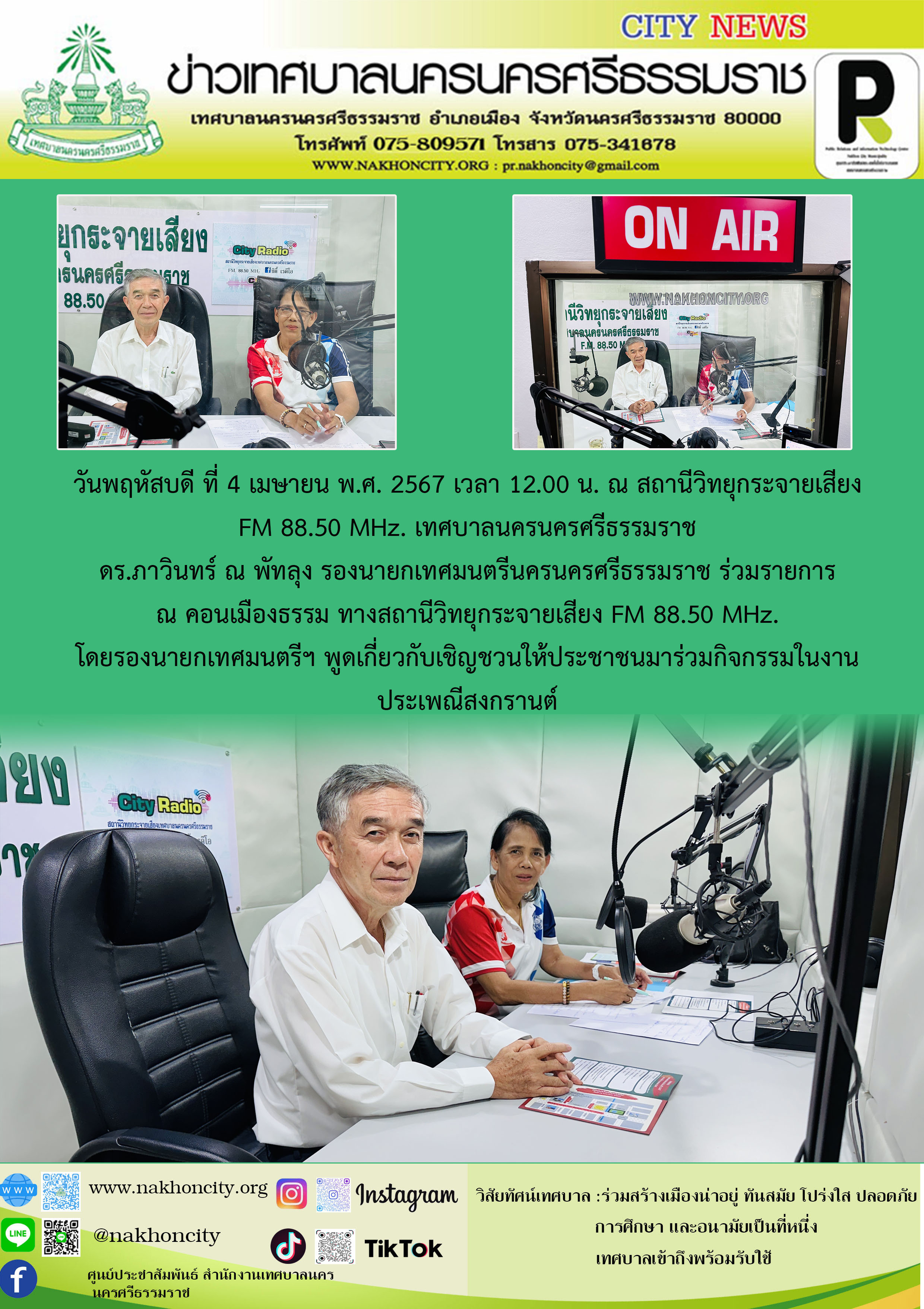 วันพฤหัสบดี ที่ 4 เมษายน พ.ศ. 2567 เวลา 12.00 น. ณ สถานีวิทยุกระจายเสียง FM 88.50 MHz. เทศบาลนครนครศรีธรรมราช