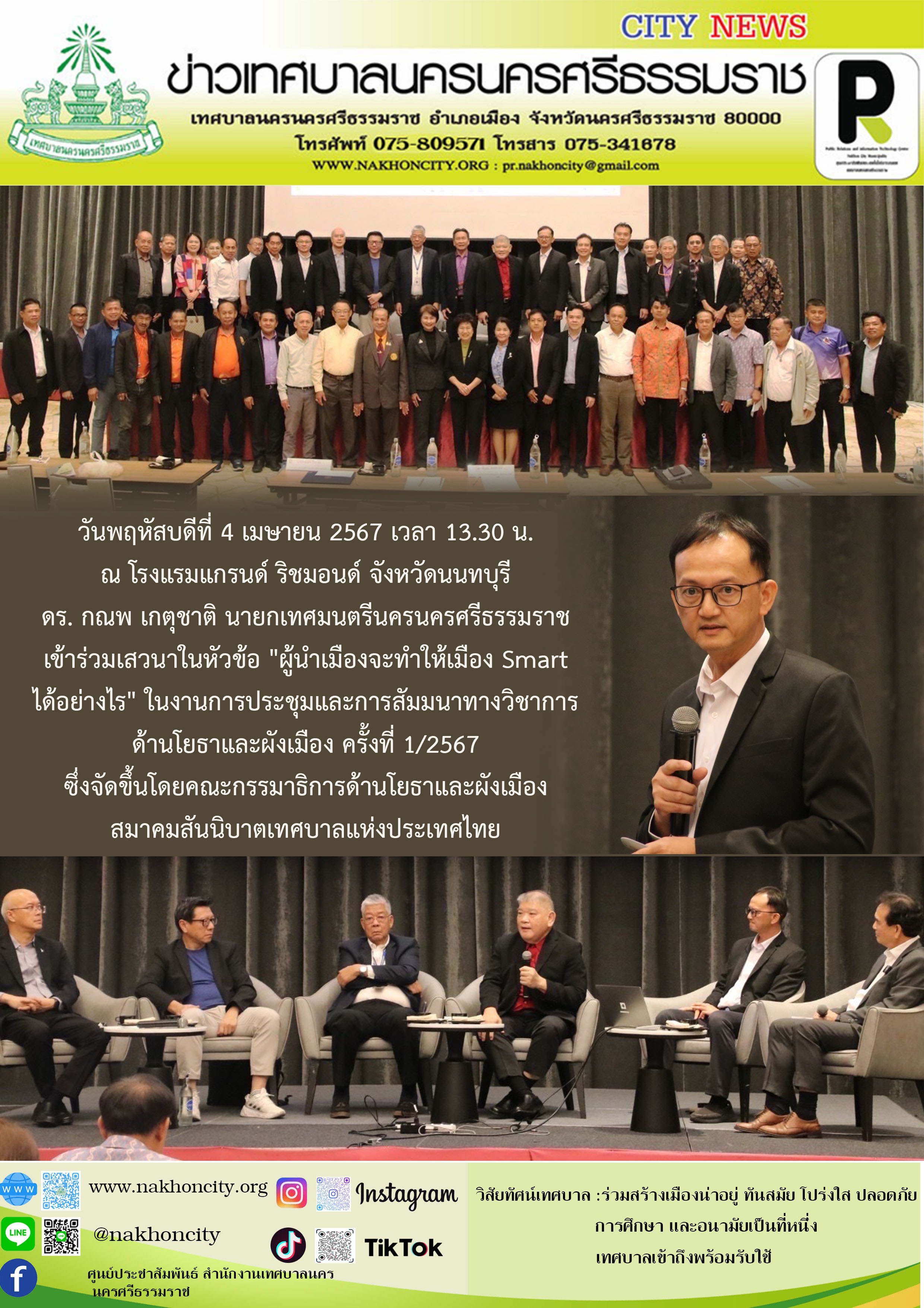 ดร. กณพ เกตุชาติ นายกเทศมนตรีนครนครศรีธรรมราชเข้าร่วมเสวนาในหัวข้อ "ผู้นำเมืองจะทำให้เมือง Smart ได้อย่างไร" ในงานการประชุมและการสัมมนาทางวิชาการด้านโยธาและผังเมือง ครั้งที่ 1/2567 |