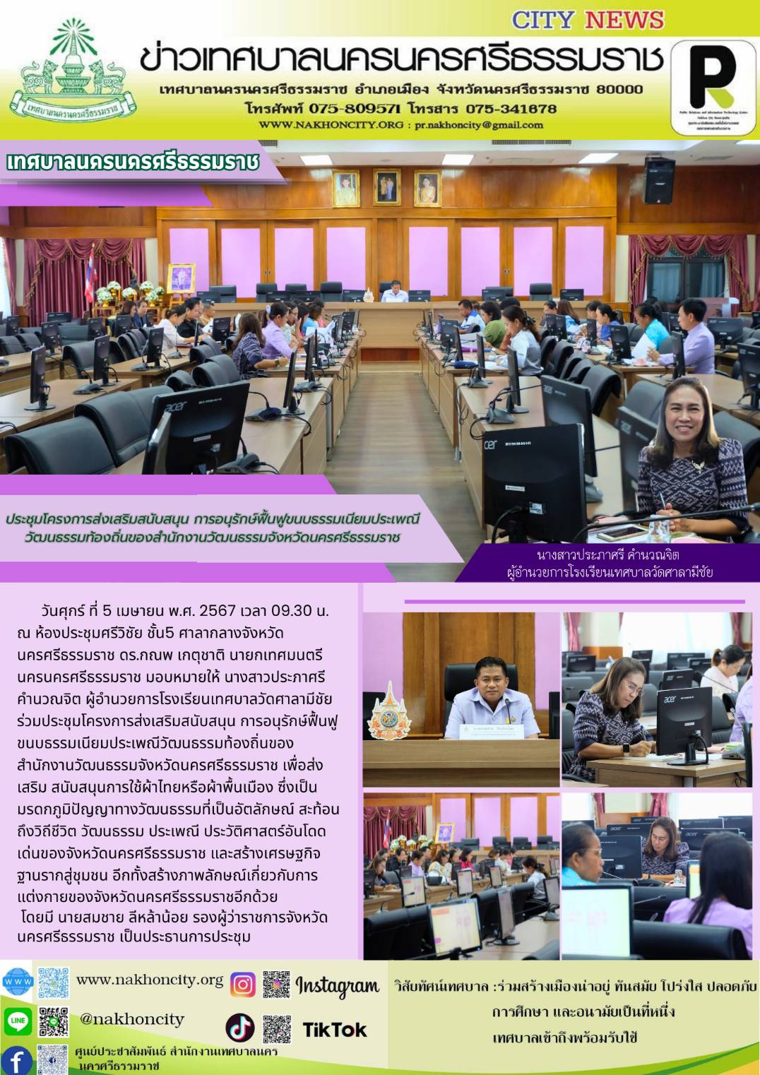 ดร.กณพ เกตุชาติ นายกเทศมนตรีนครนครศรีธรรมราช มอบหมายให้ นางสาวประภาศรี คำนวณจิต ผู้อำนวยการโรงเรียนเทศบาลวัดศาลามีชัย ร่วมประชุมโครงการส่งเสริมสนับสนุน การอนุรักษ์ฟื้นฟูขนบธรรมเนียมประเพณีวัฒนธรรมท้องถิ่นของสำนักงานวัฒนธรรมจังหวัดนครศรีธรรมราช |