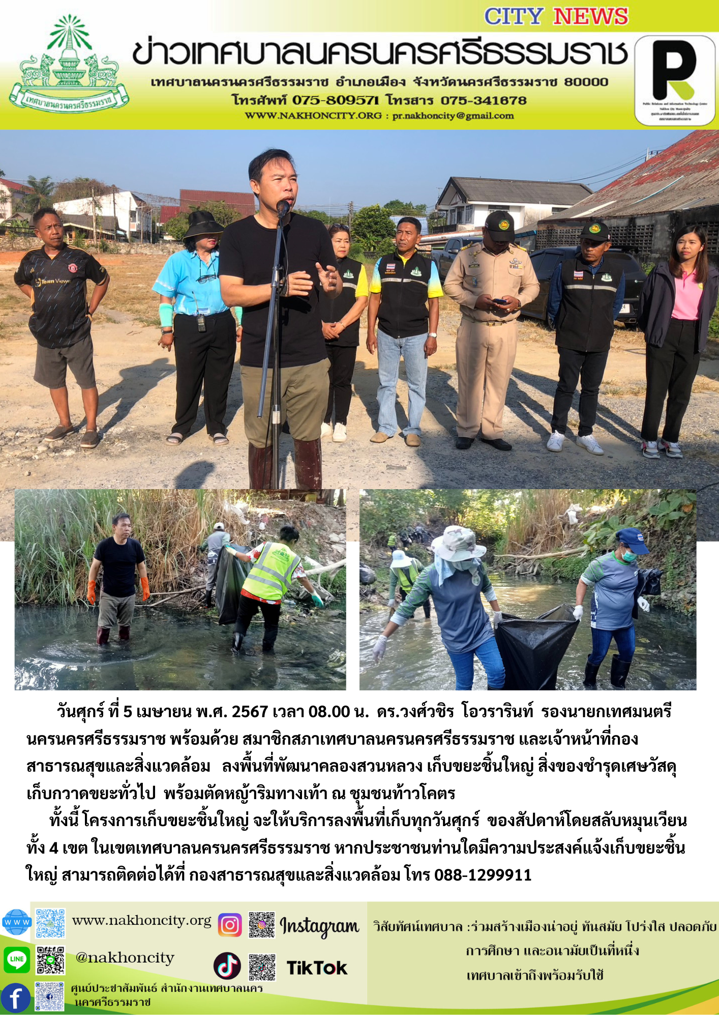 ดร.วงศ์วชิร โอวรารินท์ รองนายกเทศมนตรีนครนครศรีธรรมราช พร้อมด้วย สมาชิกสภาเทศบาลนครนครศรีธรรมราช และเจ้าหน้าที่กองสาธารณสุขและสิ่งแวดล้อม ลงพื้นที่ เก็บขยะสิ้นใหญ่ ชุมชนท้าวโคตร |