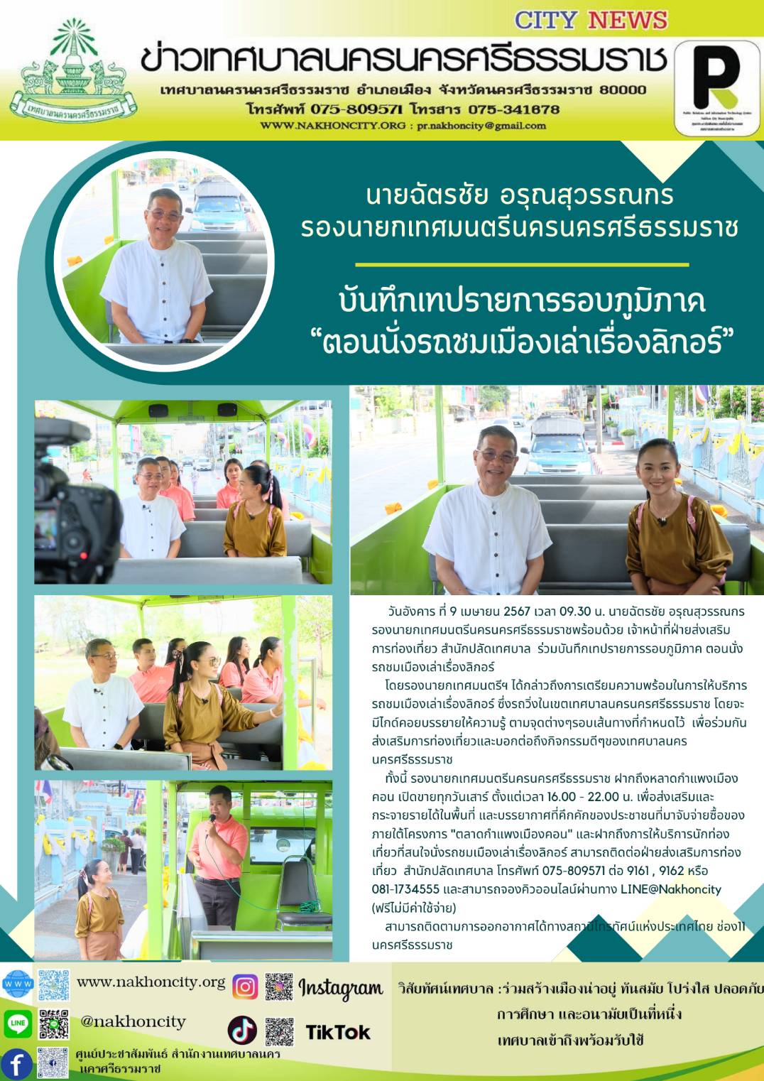 วันอังคาร ที่ 9 เมษายน 2567 เวลา 09.30 น. นายฉัตรชัย อรุณสุวรรณกร รองนายกเทศมนตรีนครนครศรีธรรมราช พร้อมด้วย เจ้าหน้าที่ฝ่ายส่งเสริมการท่องเที่ยว สำนักปลัดเทศบาล ร่วมบันทึกเทปรายการรอบภูมิภาค ตอนนั่งรถชมเมืองเล่าเรื่องลิกอร์ โดยรองนายกเทศมนตรีฯ ได้กล่าวถึงการเตรียมความพร้อมในการให้บริการรถชมเมืองเล่าเรื่องลิกอร์ ซึ่งรถวิ่งในเขตเทศบาลนครนครศรีธรรมราช โดยจะมีไกด์คอยบรรยายให้ความรู้ ตามจุดต่างๆรอบเส้นทางที่กำหนดไว้ เพื่อร่วมกันส่งเสริมการท่องเที่ยวและบอกต่อถึงกิจกรรมดีๆของเทศบาลนครนครศรีธรรมราช ทั้งนี้ รองนายกเทศมนตรีนครนครศรีธรรมราช ฝากถึงหลาดกำแพงเมืองคอน เปิดขายทุกวันเสาร์ ตั้งแต่เวลา 16.00 - 22.00 น. เพื่อส่งเสริมและกระจายรายได้ในพื้นที่ และบรรยากาศที่คึกคักของประชาชนที่มาจับจ่ายซื้อของ ภายใต้โครงการ "ตลาดกำแพงเมืองคอน" และฝากถึงการให้บริการนักท่องเที่ยวที่สนใจนั่งรถชมเมืองเล่าเรื่องลิกอร์ สามารถติดต่อฝ่ายส่งเสริมการท่องเที่ยว สำนักปลัดเทศบาล โทรศัพท์ 075-809571 ต่อ 9161 , 9162 หรือ 081-1734555 และสามารถจองคิวออนไลน์ผ่านทาง LINE@Nakhoncity (ฟรีไม่มีค่าใช้จ่าย) สามารถติดตามการออกอากาศได้ทางสถานีโทรทัศน์แห่งประเทศไทย ช่อง11 นครศรีธรรมราช …………….. ภาพ//ข่าว//จันทร์จิรา |