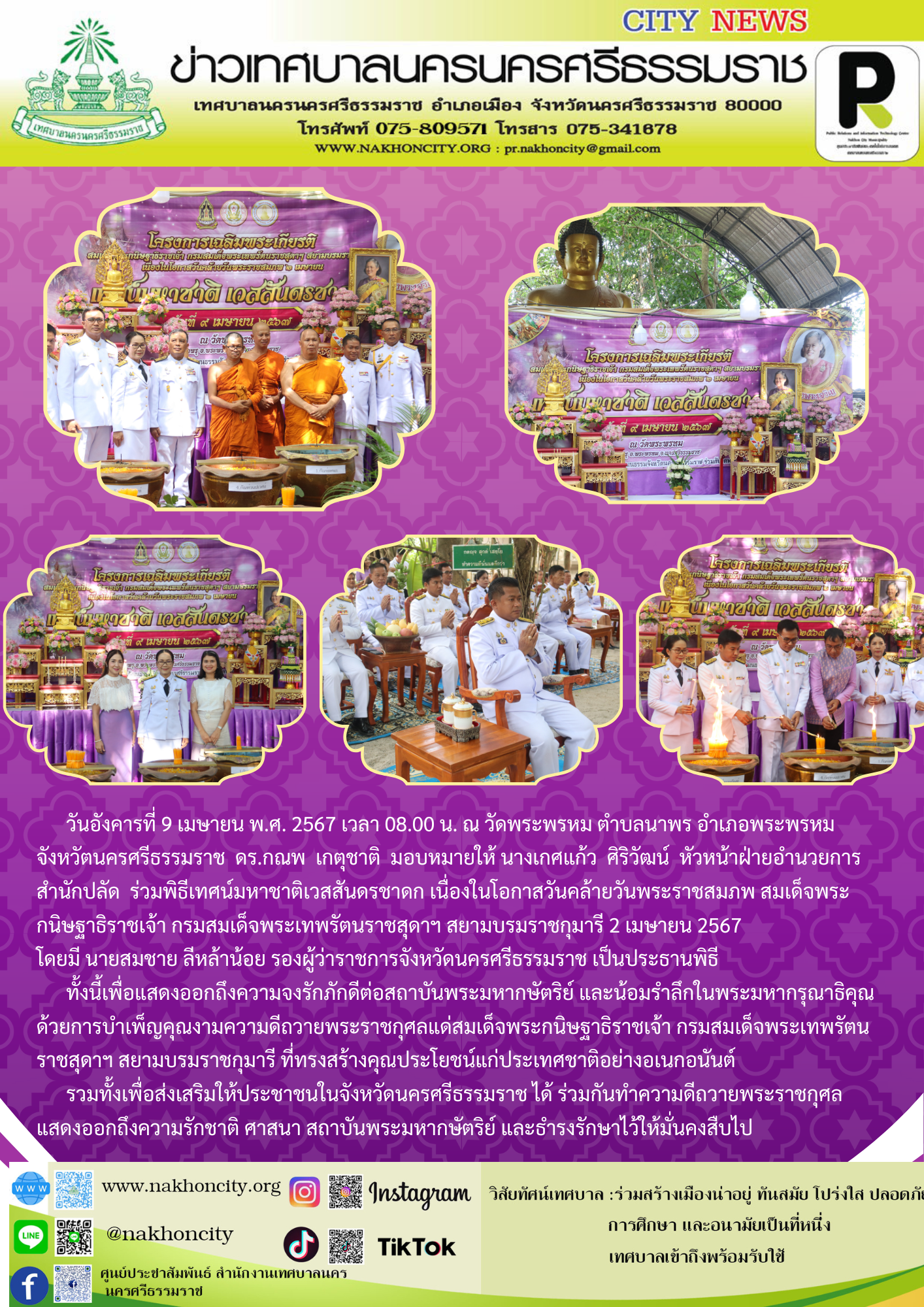 วันอังคารที่ 9 เมษายน พ.ศ. 2567 เวลา 08.00 น. ณ วัดพระพรหม ตำบลนาพร อำเภอพระพรหม จังหวัตนครศรีธรรมราช ดร.กณพ เกตุชาติ มอบหมายให้ นางเกศแก้ว ศิริวัฒน์ หัวหน้าฝ่ายอำนวยการ สำนักปลัด ร่วมพิธีเทศน์มหาชาติเวสสันตรชาดก เนื่องในโอกาสวันคล้ายวันพระราชสมภพ สมเด็จพระกนิษฐาธิราชเจ้า กรมสมเด็จพระเทพรัตนราชสุดาฯ สยามบรมราชกุมารี 2 เมษายน 2567 โดยมี นายสมชาย ลีหล้าน้อย รองผู้ว่าราชการจังหวัดนครศรีธรรมราช เป็นประธานพิธี ทั้งนี้เพื่อแสดงออกถึงความจงรักภักดีต่อสถาบันพระมหากษัตริย์ และน้อมรำลึกในพระมหากรุณาธิคุณ ด้วยการบำเพ็ญคุณงามความดีถวายพระราชกุศลแด่สมเด็จพระกนิษฐาธิราชเจ้า กรมสมเด็จพระเทพรัตนราชสุดาฯ สยามบรมราชกุมารี ที่ทรงสร้างคุณประโยชน์แก่ประเทศชาติอย่างอเนกอนันต์ รวมทั้งเพื่อส่งเสริมให้ประชาชนในจังหวัดนครศรีธรรมราช ได้ ร่วมกันทำความดีถวายพระราชกุศล แสดงออกถึงความรักชาติ ศาสนา สถาบันพระมหากษัตริย์ และธำรงรักษาไว้ให้มั่นคงสืบไป |