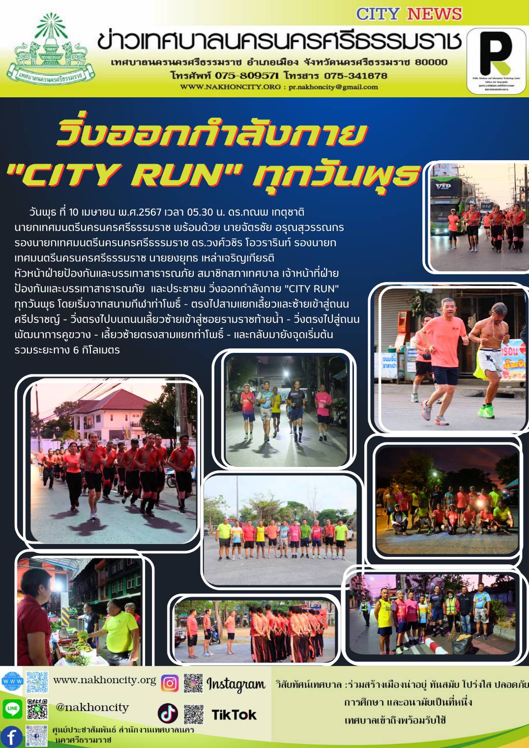 วันพุธ ที่ 10 เมษายน พ.ศ.2567 เวลา 05.30 น. ดร.กณพ เกตุชาติ นายกเทศมนตรีนครนครศรีธรรมราช พร้อมด้วย นายฉัตรชัย อรุณสุวรรณกร รองนายกเทศมนตรีนครนครศรีธรรมราช ดร.วงศ์วชิร โอวรารินท์ รองนายกเทศมนตรีนครนครศรีธรรมราช นายยงยุทธ เหล่าเจริญเกียรติ หัวหน้าฝ่ายป้องกันและบรรเทาสาธารณภัย สมาชิกสภาเทศบาล เจ้าหน้าที่ฝ่ายป้องกันและบรรเทาสาธารณภัย  และประชาชน วิ่งออกกำลังกาย "CITY RUN" ทุกวันพุธ โดยเริ่มจากสนามกีฬาท่าโพธิ์ - ตรงไปสามแยกเลี้ยวและซ้ายเข้าสู่ถนนศรีปราชญ์ - วิ่งตรงไปบนถนนเลี้ยวซ้ายเข้าสู่ซอยรามราชท้ายน้ำ - วิ่งตรงไปสู่ถนนพัฒนาการคูขวาง - เลี้ยวซ้ายตรงสามแยกท่าโพธิ์ - และกลับมายังจุดเริ่มต้น รวมระยะทาง 6 กิโลเมตร