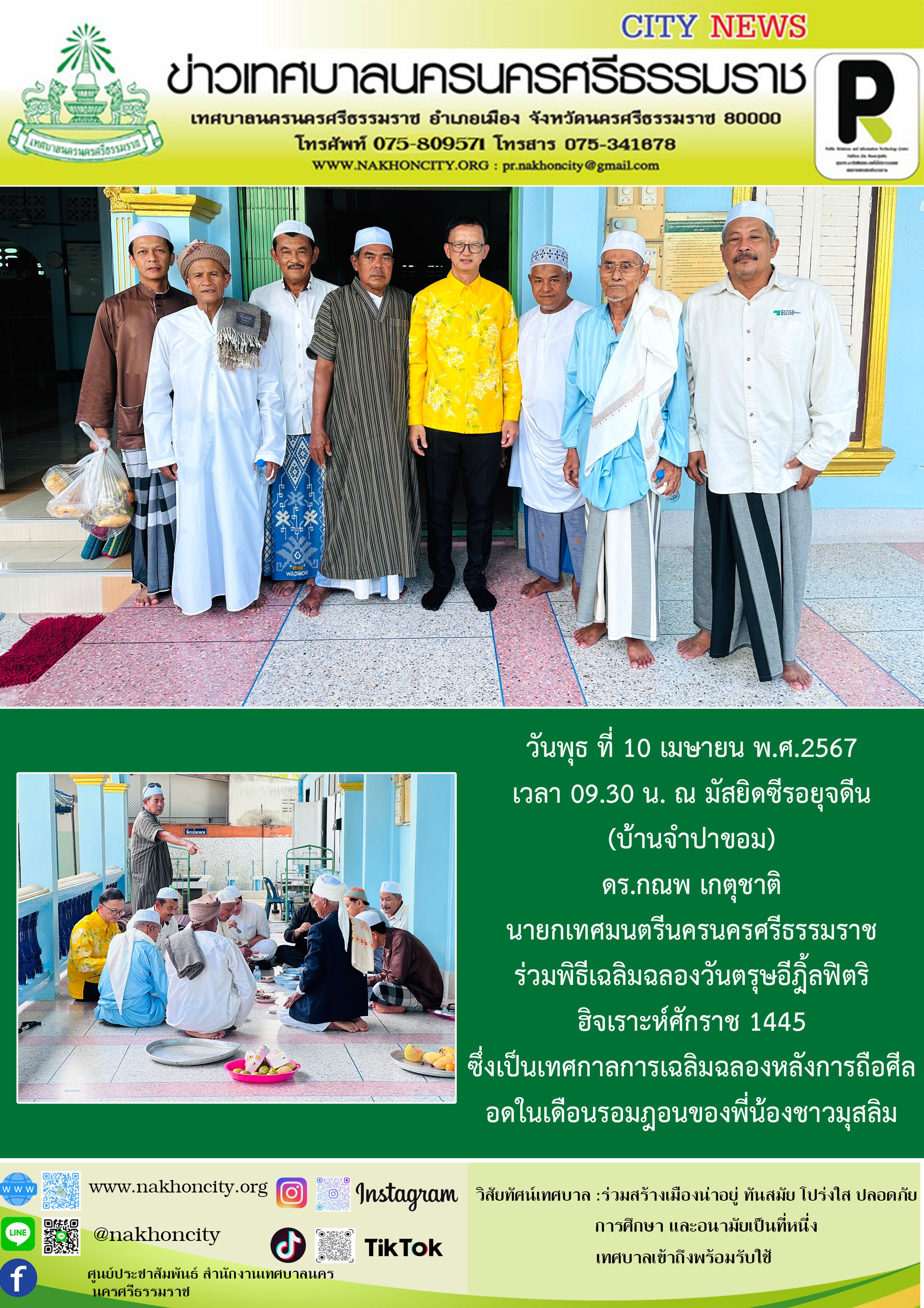 ดร.กณพ เกตุชาติ นายกเทศมนตรีนครนครศรีธรรมราช ร่วมพิธีเฉลิมฉลองวันตรุษอีฎิ้ลฟิตริ ฮิจเราะห์ศักราช 1445 ซึ่งเป็นเทศกาลการเฉลิมฉลองหลังการถือศีลอดในเดือนรอมฎอนของพี่น้องชาวมุสลิม |