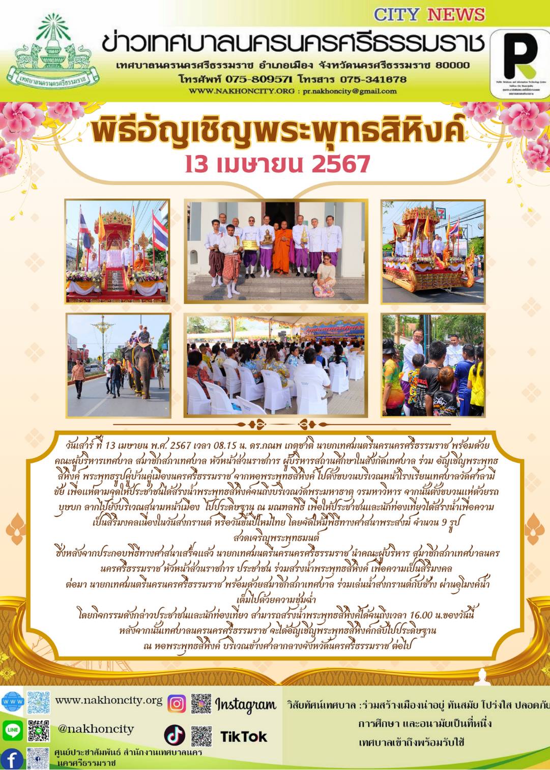 ดร.กณพ เกตุชาติ นายกเทศมนตรีนครนครศรีธรรมราช พร้อมด้วย คณะผู้บริหารเทศบาล สมาชิกสภาเทศบาล หัวหน้าส่วนราชการ ผู้บริหารสถานศึกษาในสังกัดเทศบาล ร่วม อัญเชิญพระพุทธสิหิงค์ พระพุทธรูปคู่บ้านคู่เมืองนครศรีธรรมราช |